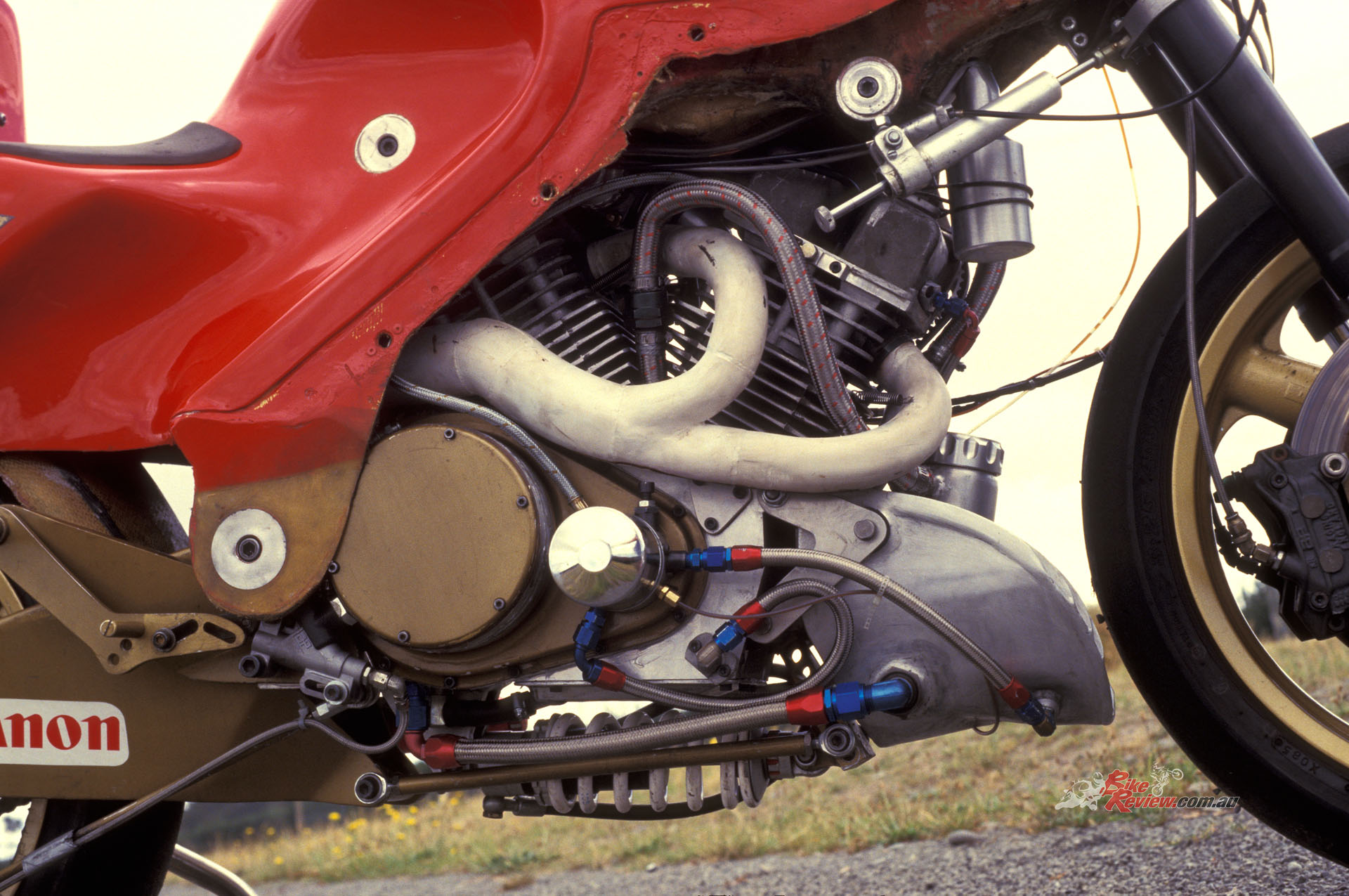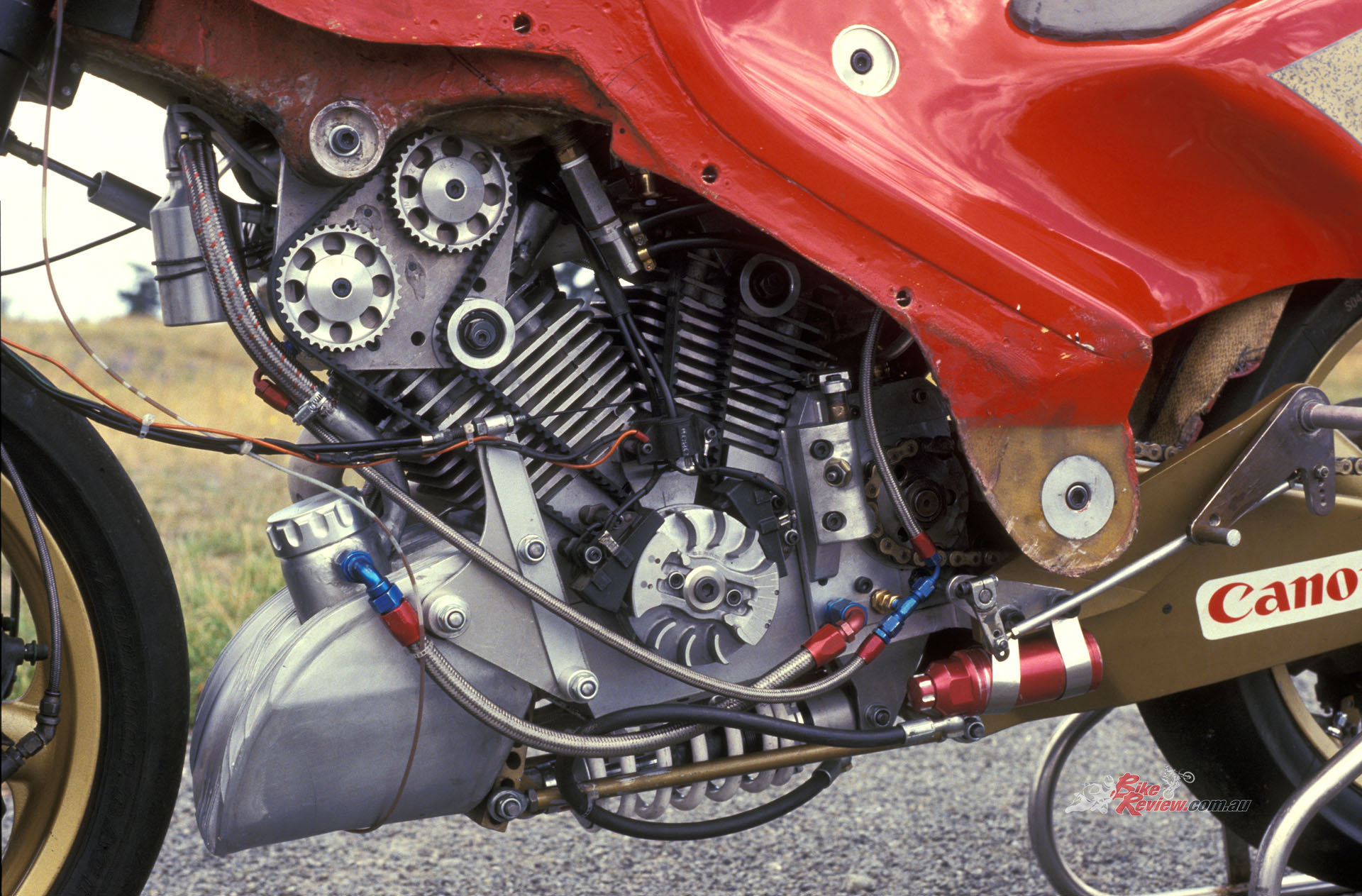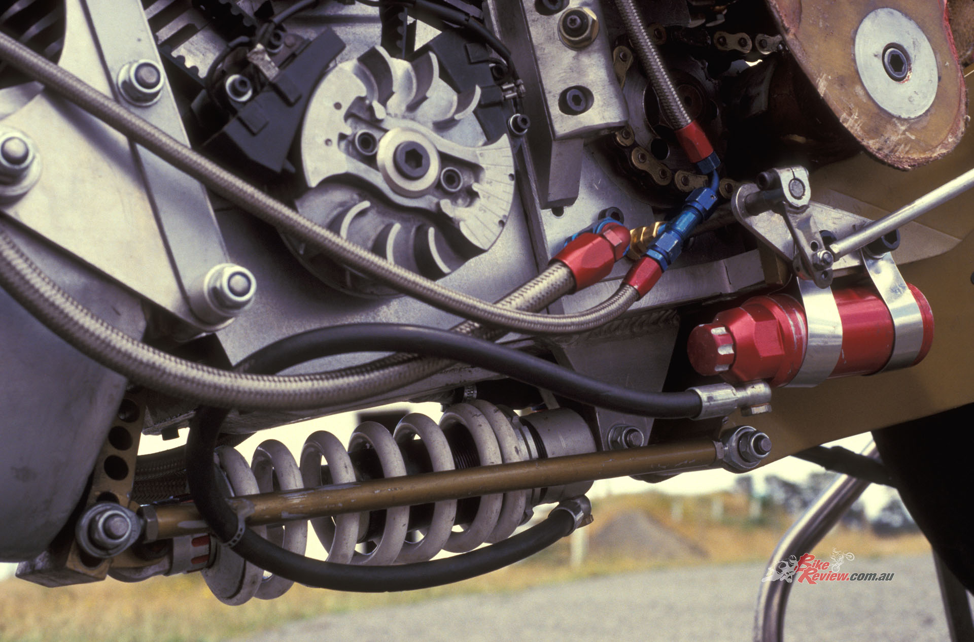 The use of the Speedway engine with total loss lubrication also dictated a revised oil system incorporating a return delivery, plus uprated oil feed to the crank. 120hp@9000 rpm at the rear wheel was claimed for the motor – potent for the time, when Marco Lucchinelli’s factory Ducati shortly to win the first-ever World Superbike round at Donington in April 1988, yielded 125hp. Running on a 13.5:1 compression and, of course, methanol – hence the minimal finning on the alloy cylinders – the whole engine scaled in at just 55kg, with ignition provided by a US-made Phelan flywheel magneto (originally designed for chain-saw use) mounted on the left end of the crankshaft, outboard of the bottom pulley for the twin cambelts.