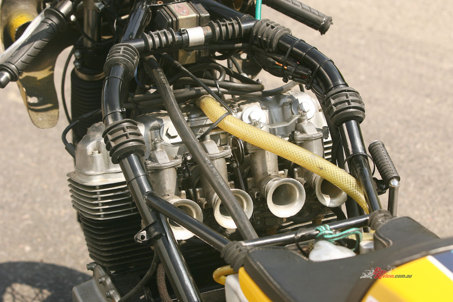 ENGINE: Air-cooled SOHC transverse in-line four-cylinder four-stroke with central chain camdrive, 736cc, 10.2:1 Compression Ratio, 4 x 33mm Keihin CR, RSC self-generating energy transfer, 61 x 63mm bore x stroke, 5-speed RSC close-ratio with 2 x single-row chain primary drive, Multiplate oil-bath clutch.