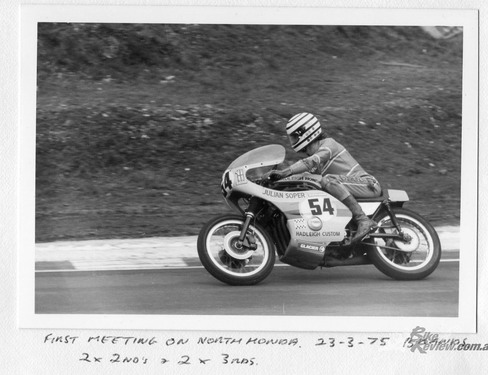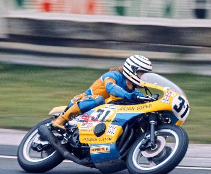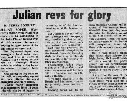 The Hadleigh Honda’s successful debut season included top showings at International level, as in the King of Brands May meeting when Soper finished sixth in the MCN Superbike round behind race winner Mick Grant on the Stan Shenton-run Kawasaki KR750 and teammate Barry Ditchburn, with only John Newbold on the works Heron Suzuki TR750 ahead of Soper, and Stan Woods and Percy Tait on similar bikes behind, as well as all the by now increasingly numerous TZ750 Yamahas.