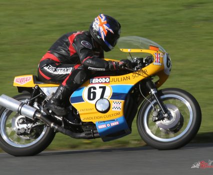 The cylinder head was ported and flowed, while Soper experimented with a mix of carbs. “I tried various carburettors, Mark 1 and Mark 2 Amal Concentrics, the standard 28mm Keihin PD carbs, and also the CR Keihins which made it very top-endy, but most of the time I used the Mark 2 Amals,” said Julian. Despite eight race wins in 1974 using the Dresda frame, including a trio of victories at a Snetterton National, Soper wasn’t happy with the way the Dresda steered, so having acquired the Rob North frame he simply squeezed the same big bore motor in it for 1975, then marked a successful debut with the result with a pair each of seconds and thirds in the opening meeting of the season at Brands Hatch.