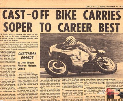 ”I realised I couldn’t carry on, and so I sold the bike,” said Julian. “Barry [Sheene] had helped as much as he possibly could, and he’d offered me his two 750 Suzuki triples when Suzuki gave him the RG680 square fours, but I said no, I can’t afford to run them. I just sold the TZ, and that was it. And then in February 1978 I opened MCN and saw I’d been selected for the British team in the Transatlantic Match Races – but I had no bikes, so I couldn’t do it! End of story.”
