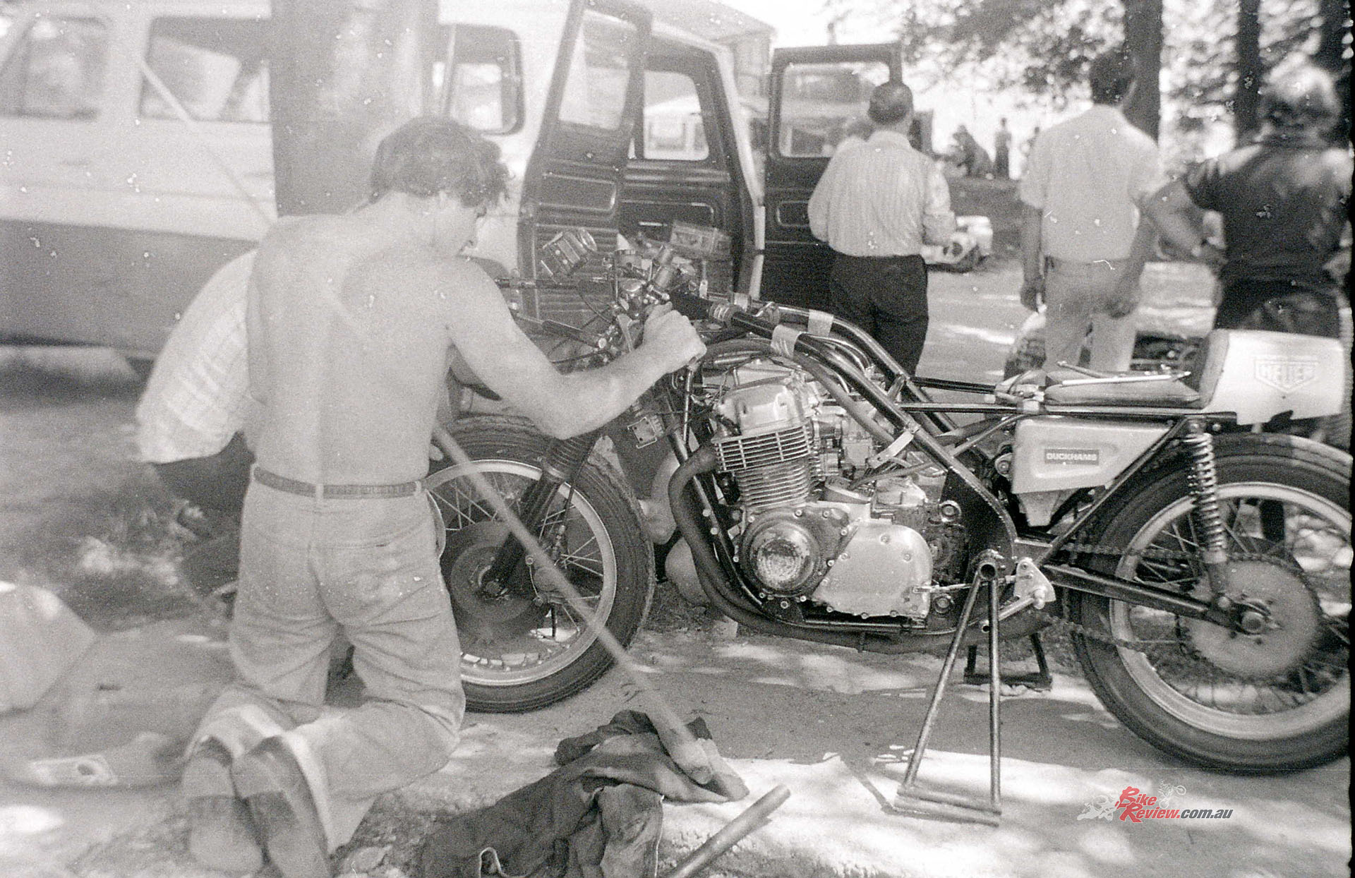 For our Mallory Park outing Gordon Russell had had to fit a silencer to the 4-1 open exhaust Soper always raced the bike with in 900cc form.