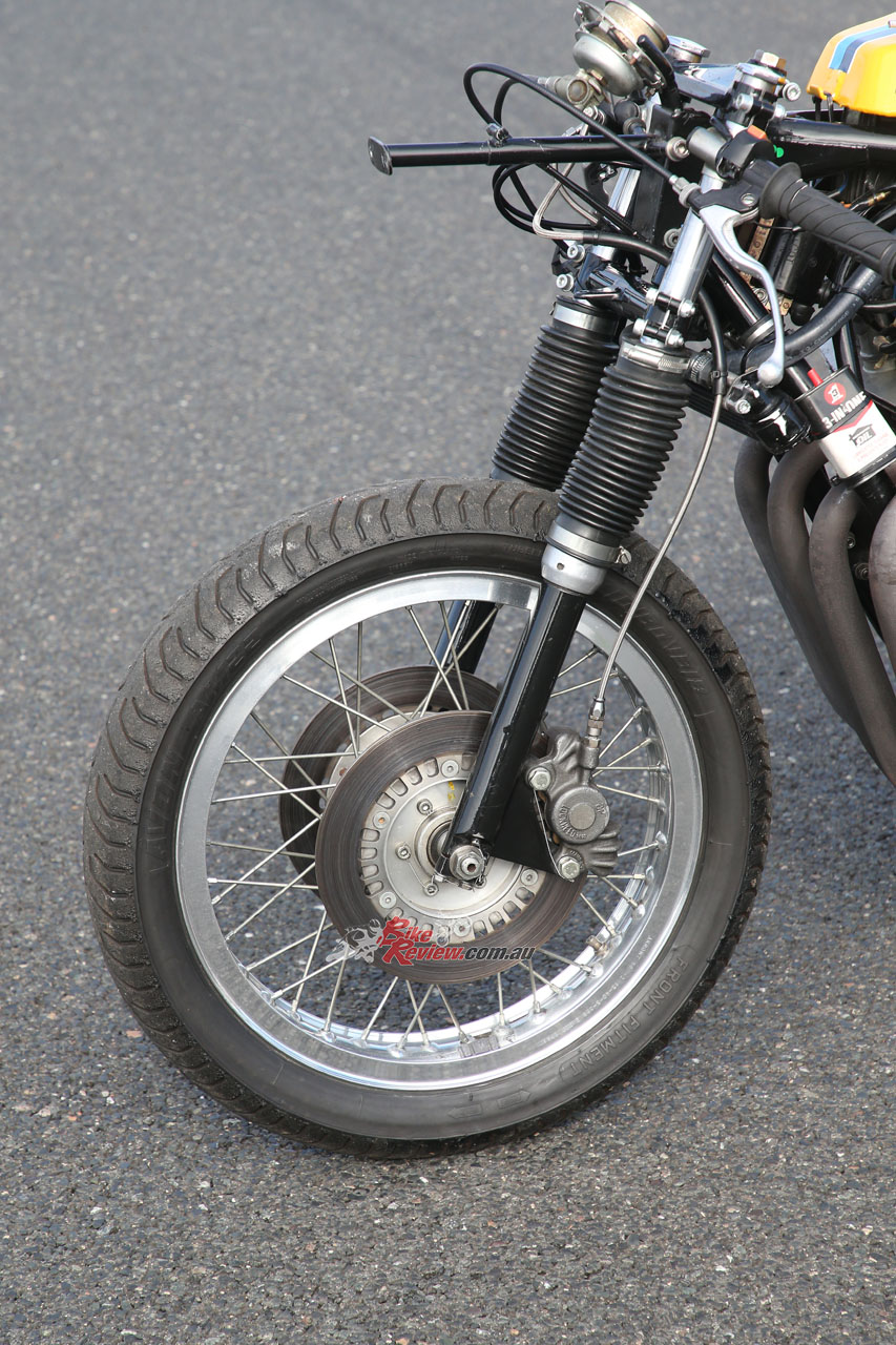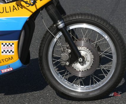 Fitted with four 33mm Keihin CR carbs Gordon estimates power to be around 75hp@9,500rpm, taking the known quantity of the tricked-out 85bhp 750cc Triumph triples he’s raced it against en route to three top ten F750 finishes at successive Goodwood Members Meetings. “It’s a little bit slower than them, but fast enough to keep up,” he says. “Chris and I were determined to get it raceworthy again, but we’ve never planned on making it into a contender for victory, because it’s not the right thing to do with what amounts to history on wheels.”