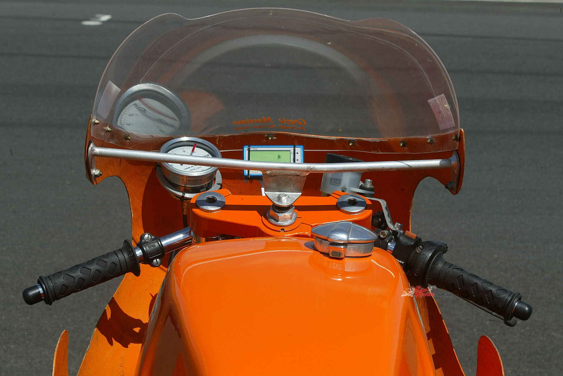 The seat’s very low, so working the back brake would have been hard even if I’d wanted to, but Ken Watson apparently never did so either, so I guess that’s OK. But this means you feel very much a part of the bike, ensconced within it, so being able to tuck away behind the screen down Broadford’s two straights wasn’t a problem for me, despite being a fair bit taller than Ken. The Veglia tacho offset to the left (there’s a digital lap-timer in the centre) has the famous but spurious ten grand redline that wound up ducatisti so well back then, so it reads 2,000 rpm high, and the engine’s true limit is in fact 8,000 revs, with peak power of 90 bhp delivered at 7,800rpm.