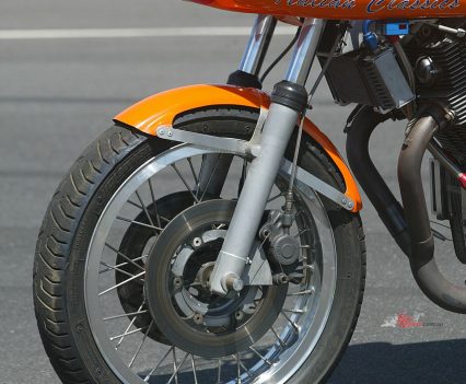 But the clean carburation delivered by the well dialled-in 40mm Dell’Ortos gives an eager pull from 3,000rpm upwards, with a notably stronger build of power from five grand onwards accessed via the light-action throttle. This has extra purchase for your right hand delivered via the rubber bands wrapped around the twistgrip rubber, making it semi-elliptical. Use the revs to keep the engine running hard, and you’ll be rewarded with outstanding acceleration out of slower turns by the standards of what started out life as an early-‘70s parallel-twin.