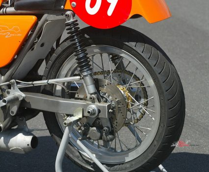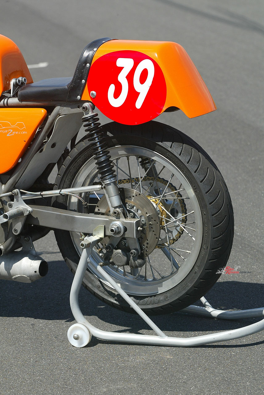 A period-style box-section swingarm later cured the problem of the original Laverda one breaking under the extra torque of the new engine, providing a much shorter 1435mm wheelbase compared to the original 750SFC’s 1470mm stride. This also laid down the extra performance from the now much more potent motor built by Wollongong engineer Chris Dowde, using the large stock of spare parts Cutler had assembled down the years.