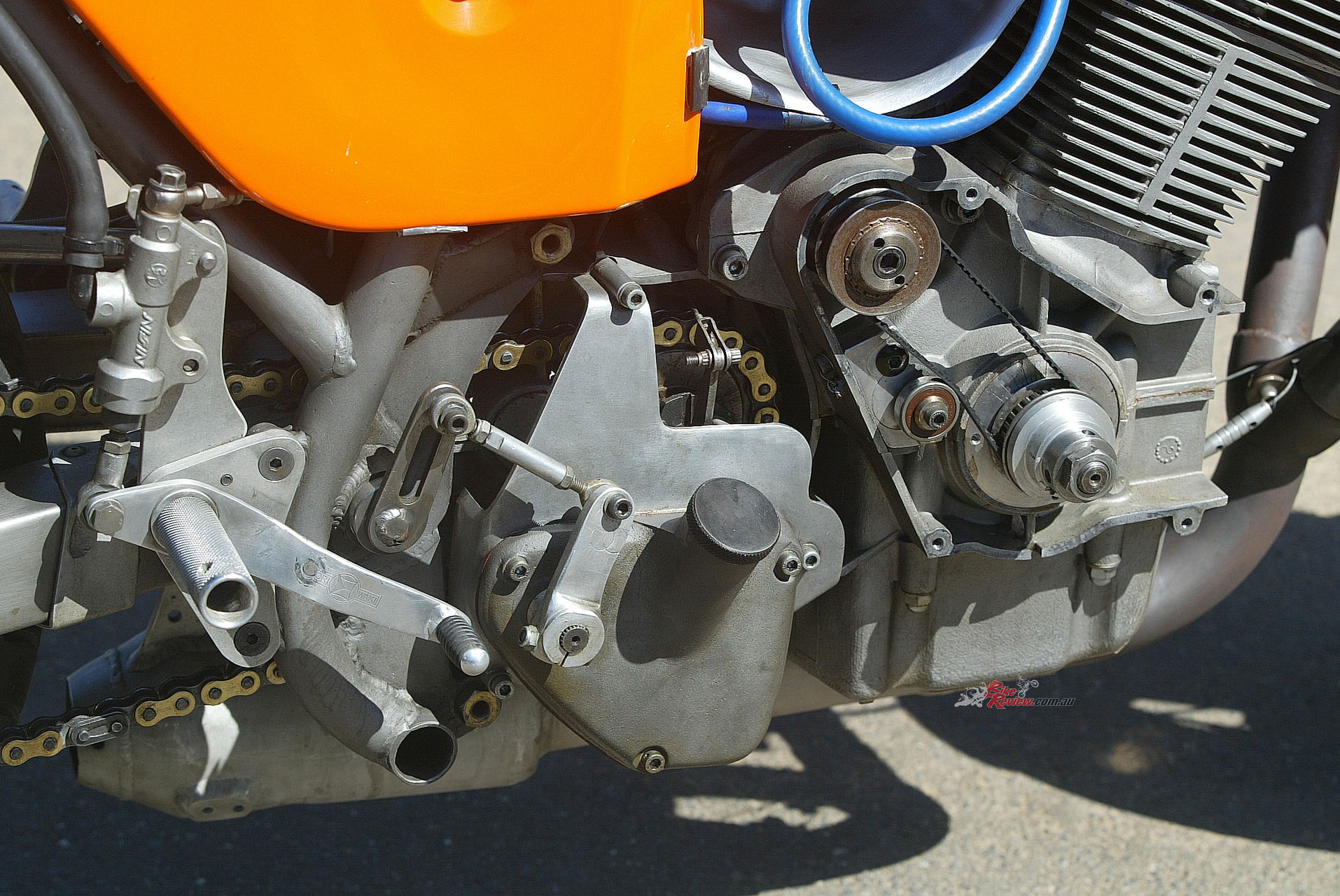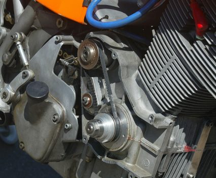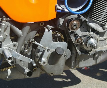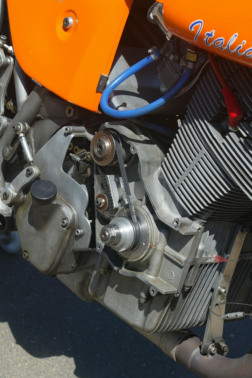 To handle the extra power, Cutler concocted a five-speed gearbox combining SF and SFC shafts with specially made gears to close up the taller ratios, matched to the robust 13-plate stock wet clutch designed for Endurance racing. But the original oil-bath triplex chain primary drive proved troublesome, and the belt primary replacing it still ran in oil and sometimes overheated.