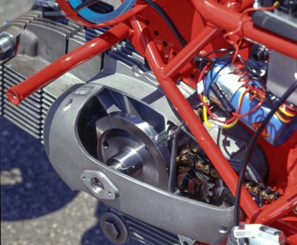 To achieve this, Zanzani took new sandcast crankcases with his name cast into them, and fitted a lightened and rebalanced roller-bearing crankshaft with external flywheel, a Carrillo conrod carrying a forged Asso piston delivering 11.1:1 compression, his own special C8 camshaft actuating competition aluminium pushrods, and peened and polished race rockers of a new design. The new cylinder carrying a cast iron sleeve was also sandcast, and carried one more fin on each of its four sides than before, for enhanced cooling.