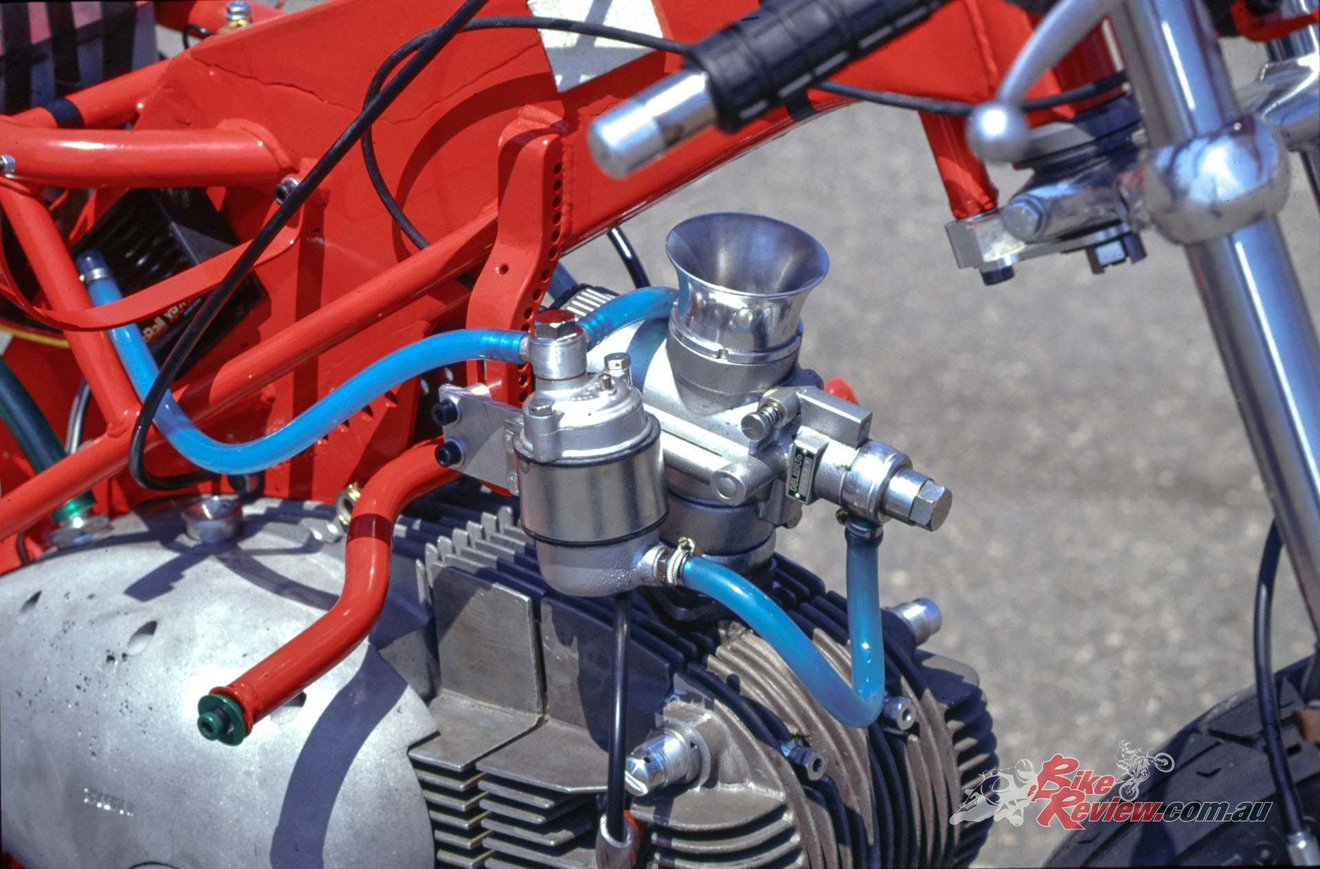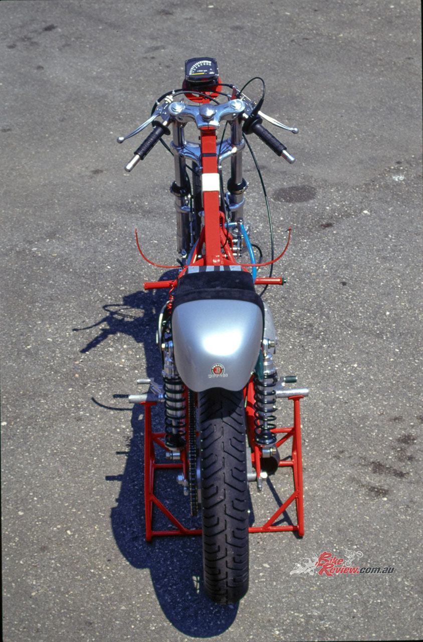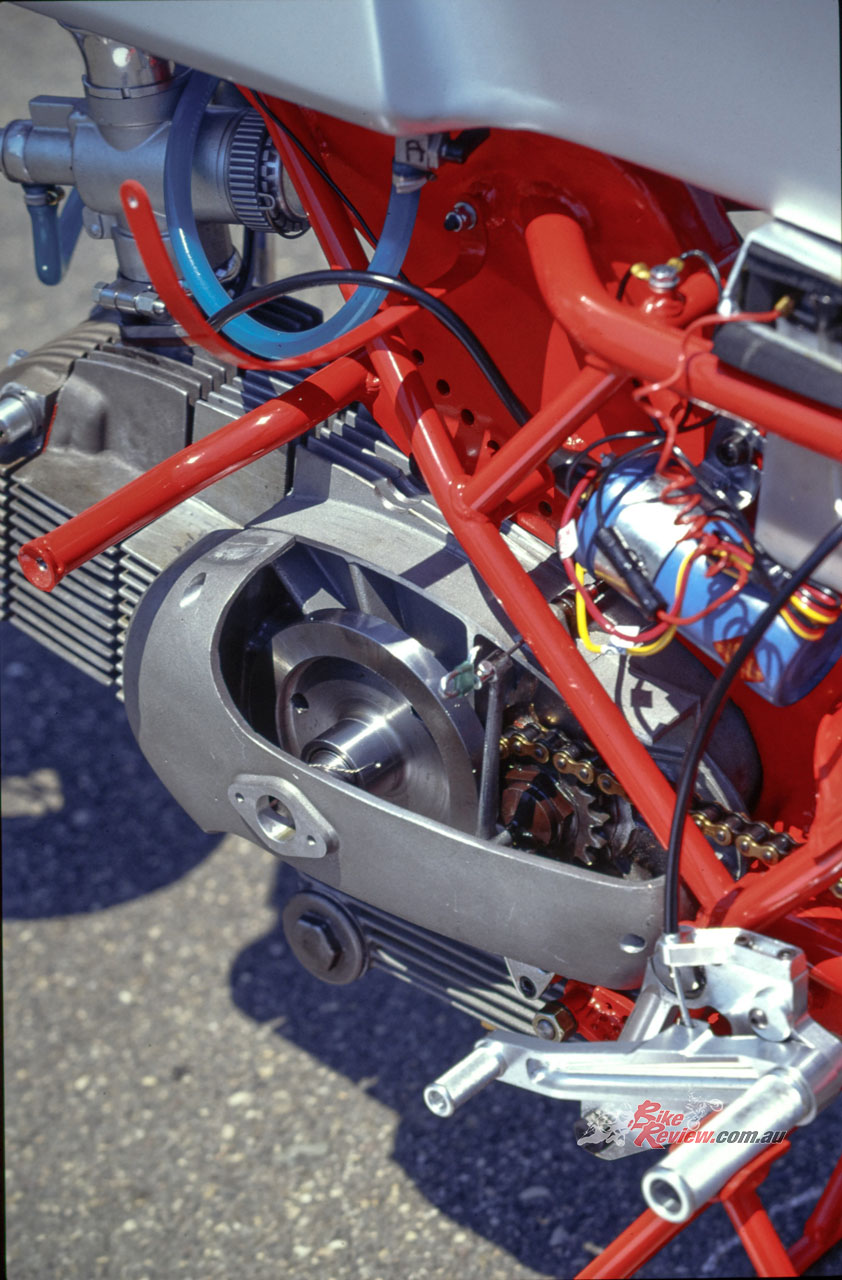 The high compression O-ring cylinder head was ported and flowed, then fitted with oversize sodium-filled 40mm inlet and 34mm exhaust Zanzani valves made to aircraft quality, running in bronze valve guides, each fitted with dual US-made RG springs, and set at a 10-degree wider included angle of 58° compared to the road 250, because of their larger diameter (stock: 35mm/32mm). America also provided the Crane Cams electronic ignition running 44° of advance, which required a healthy 12v battery, while carburation came from a period 38mm Dell’Orto SS1 with remote float, and no idle jet. Add in a close-ratio five-speed Zanzani gearbox which retained the road bike’s oil-bath clutch as was required under period MSDS rules – and go. I did.