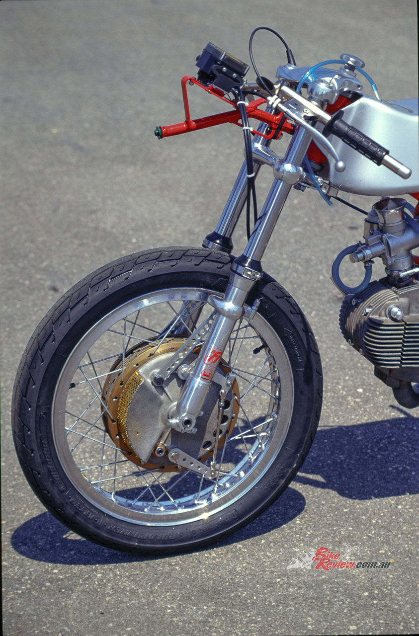 MotoBi saw some success, but the global Japanese onslaught meant diminishing sales and no budget for racing, so in 1970 the MotoBi factory race department was closed, leaving Zanzani to start his own machine shop operation in Pesaro, where he built another 15 Sei Tiranti racers in the early ’70s. But in parallel with this, Zanzani developed a specialist expertise in the disc brake technology then new to motorcycles, but which he’d been the first in the world to adopt on any GP racer back in 1965 on the four-cylinder Benelli 250, using US-made Airheart discs rather than the Campagnolo disc brakes then produced in Italy for lightweight 50/125GP machines.