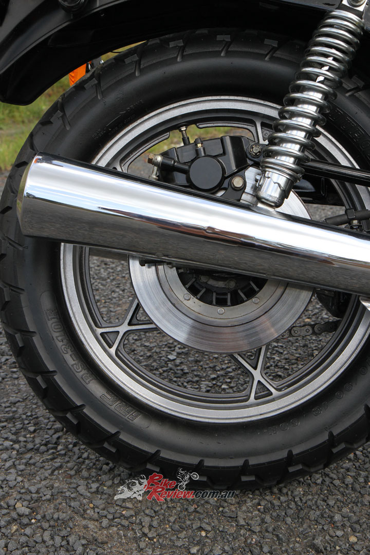 Chassis: Single backbone thin wall mild steel frame, twin shocks and conventional forks, dual front rotors with twin-piston calipers (f), single rotor with twin-piston caliper (r), 19in and 18in mag wheels, 232kg dry.
