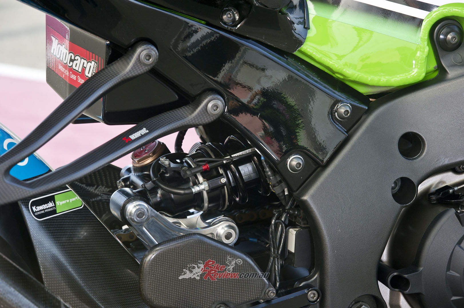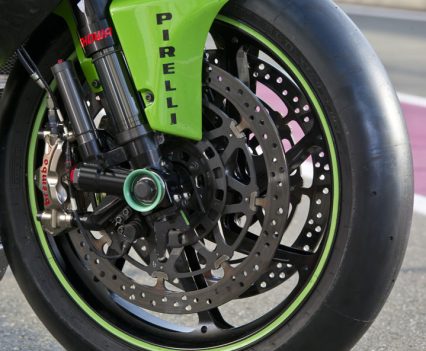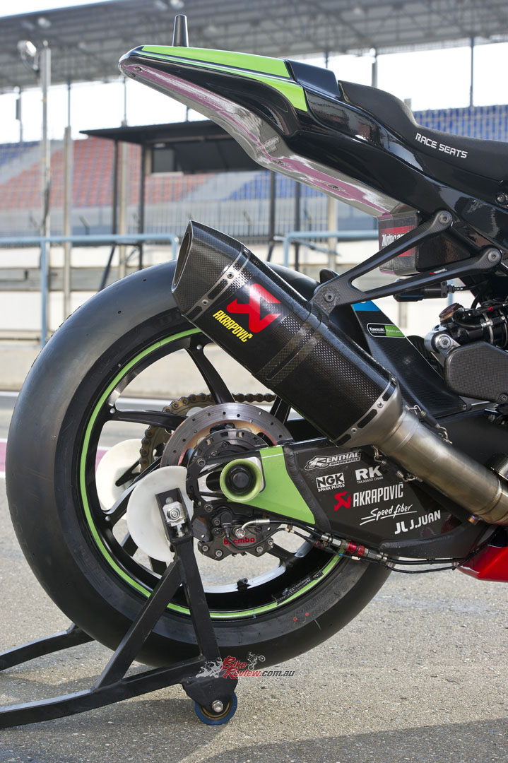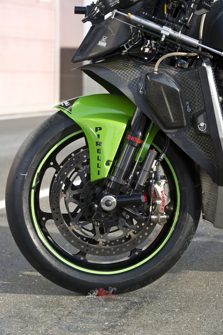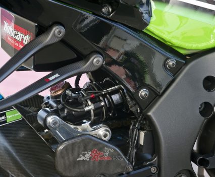 CHASSIS: Stock ZX-10R frame with bracing around the head stock and an insert for head angle changes. Swingarm pivot point adjustable, factory swingarm, carbon-fibre sub-frame, KHI rearsets, ‘bars, levers and controls, Showa factory suspension, Marchesini wheels, Brembo brakes, SpeedFiber carbon-fibre bodywork