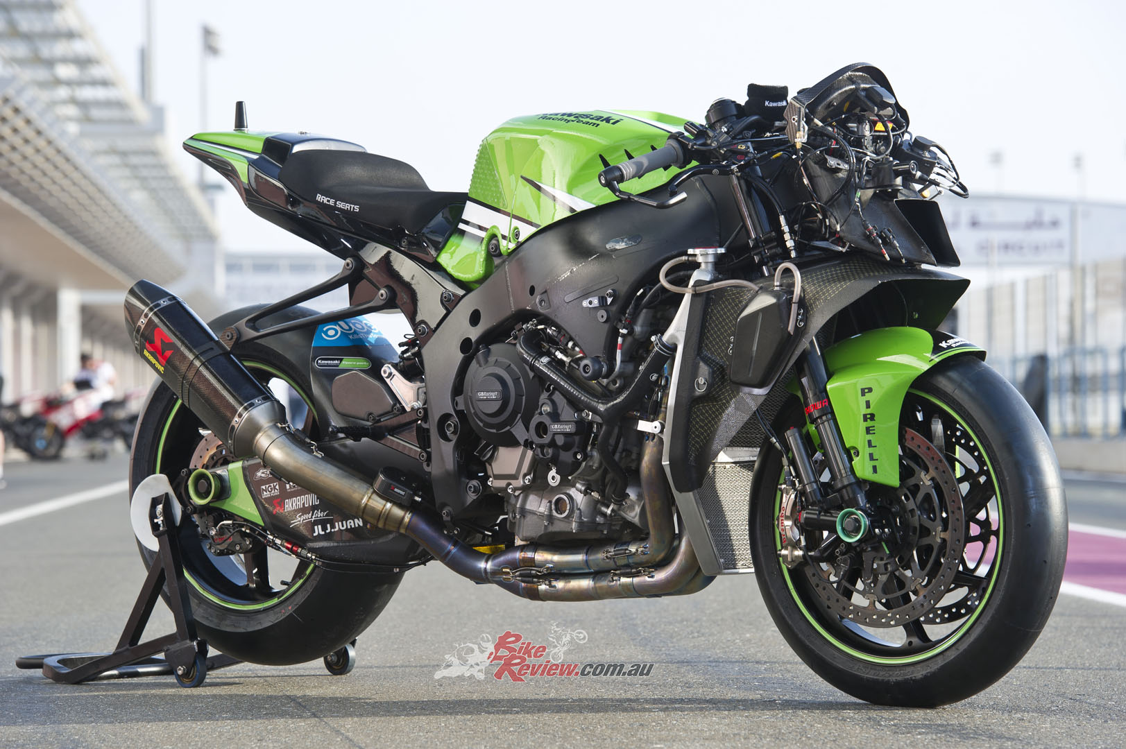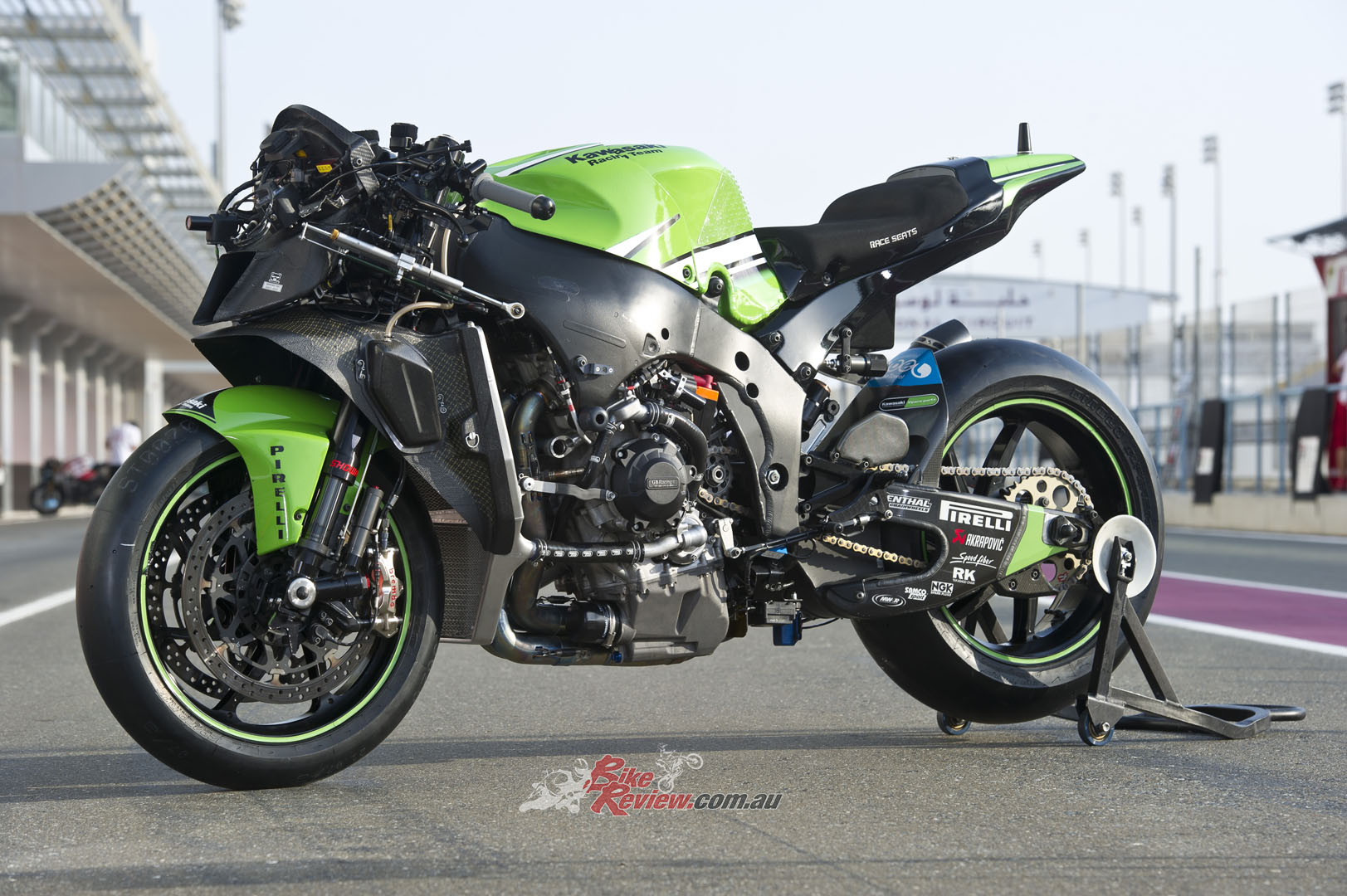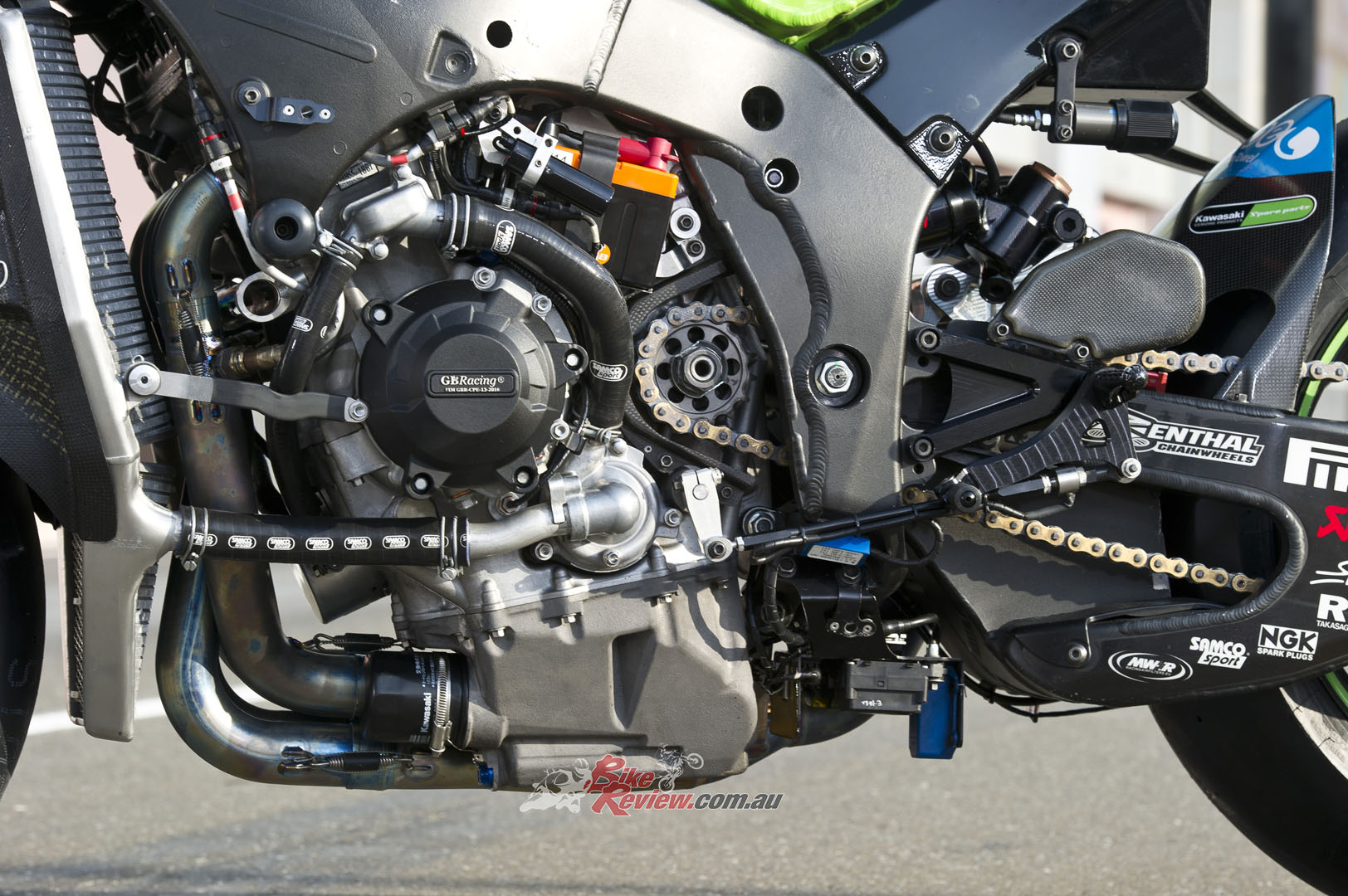 CHASSIS: Stock ZX-10R frame with bracing around the head stock and an insert for head angle changes. Swingarm pivot point adjustable, factory swingarm, carbon-fibre sub-frame, KHI rearsets, ‘bars, levers and controls, Showa factory suspension, Marchesini wheels, Brembo brakes, SpeedFiber carbon-fibre bodywork