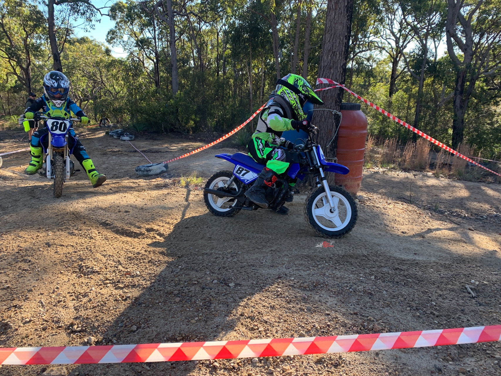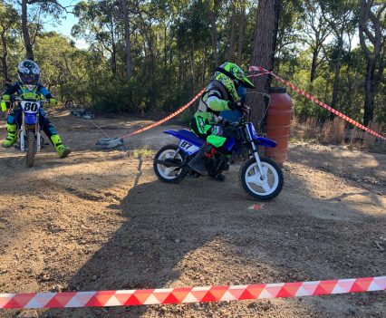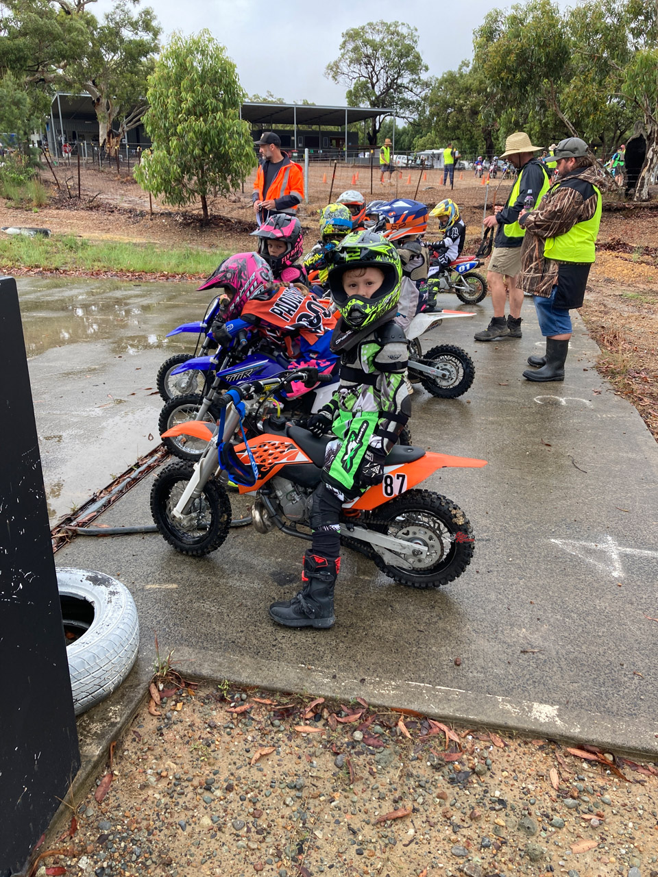 Anthony Ware #87 leading the oncoming charge of the 50cc two-strokes over the line at his local minibike club in a non-competitive riding session, that always ends up competitive! The Torrot managed to hold them off until the flag.