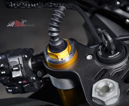 The only changes to the engine seem to me on paper to be for environmental reasons – Cat converters (four of them) moved closer towards the exhaust ports/headers so they get hotter quicker and burn more poison earlier, a more restrictive muffler, injectors moved and with fewer holes, revised camshaft profiles and rocker arm/valve acceleration ratio for improved efficiency and full cable-less RbW to give the software engineers complete control over how much juice is burned versus how much juice the rider wants to burn. So nothing too major engine-wise but still a cracker of a motor…