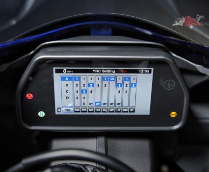 A new Engine Brake Management (EBM) system also allows the rider to select between three levels of engine braking force to suit their individual preference or riding situation on the road or track. Both the BC and EBM settings are adjustable through onboard Yamaha Ride Control (YRC) and Yamaha’s Y-TRAC smartphone (Android only) and tablet app (Android and iOS).