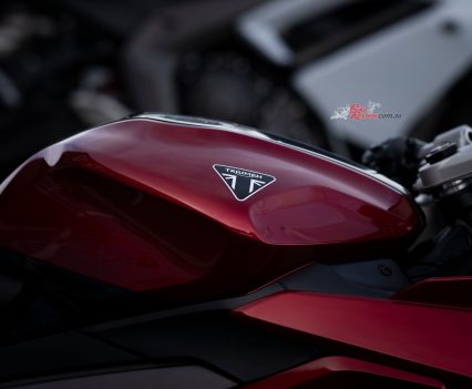 The Daytona’s triple delivers 95hp@11,250rpm with a 12,650rpm redline. More than 80 per cent of its 69Nm of peak torque is available from just 3125rpm. Triumph say that by blending low-down torque and the tractability of a twin with the free-revving top end performance of an inline four, the engine has a unique triple soundtrack, further enhanced by the new exhaust which features 3-into-1 headers and a compact underslung silencer with stainless steel finisher.