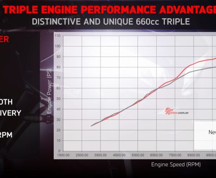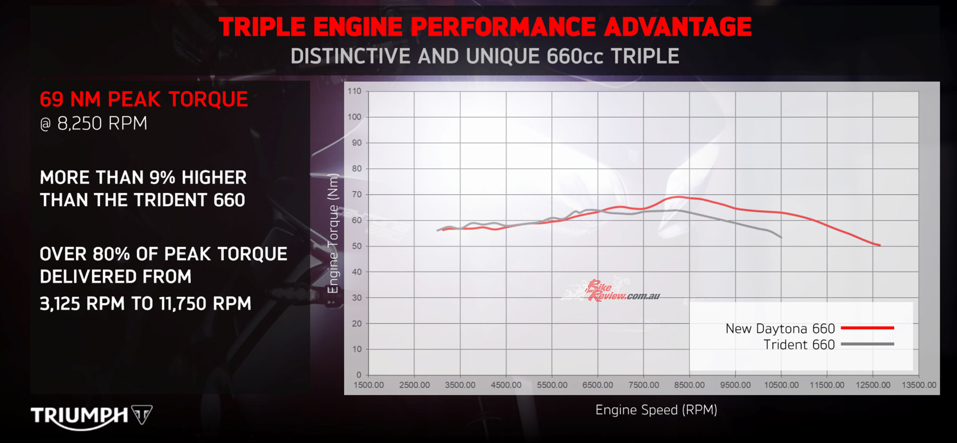 The triple delivers 95hp at 11,250rpm with a 12,650rpm redline. More than 80 per cent of torque is from 3125rpm.