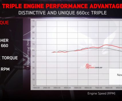 Now, the power deliveries of the two engines. The Full Power Daytona 660 with its 95-horsepower and 69Nm or torque is a beautiful sweet sounding and quick revving motor that delivers great low down pulling power and also has the horsepower to pull good speeds. It revs to over 12,000rpm with peak power at 11,250rpm. Peak torque is at 8.250rpm but it is making 80 per cent of its torque at 3150rpm! That is real strong low down grunt from the 660 triple.
