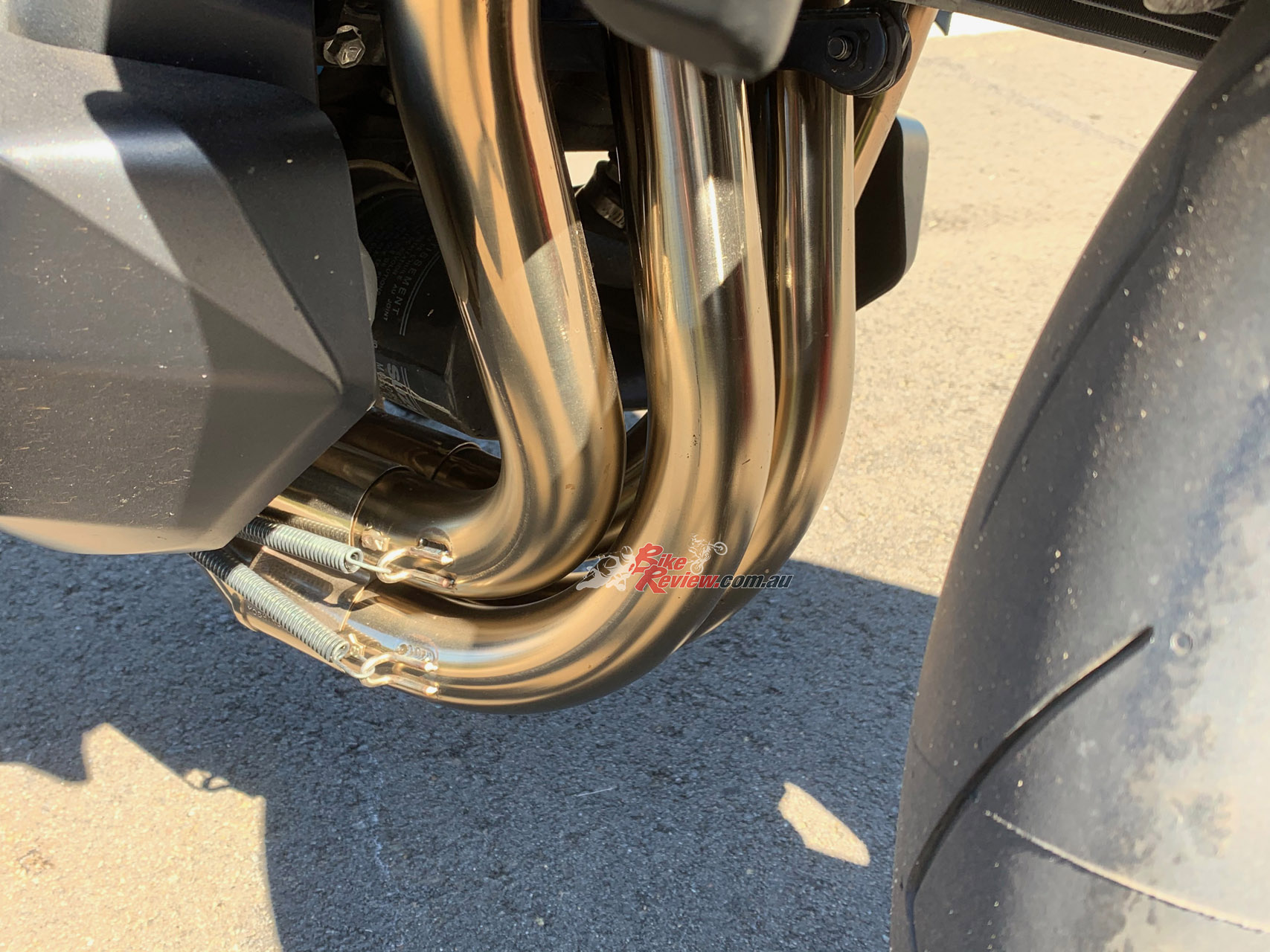 44mm throttle-bodies are used, utilising the SDTV (Suzuki Dual Throttle Valve) system, where the secondary valves are servo controlled. The injectors are 10-hole long-nose units. The airbox is all-new, as is the exhaust system, which features equaliser pipes between cylinders one and four and, two and three. The catalytic converter is at the header collector box, which then joins the large volume exhaust chamber. The muffler features a flapper valve, or SET (Suzuki Exhaust Tuning) system. Throttle position, gear position and engine rpm determine the opening of the servomotor driven valve, controlling pressure waves for optimum performance.