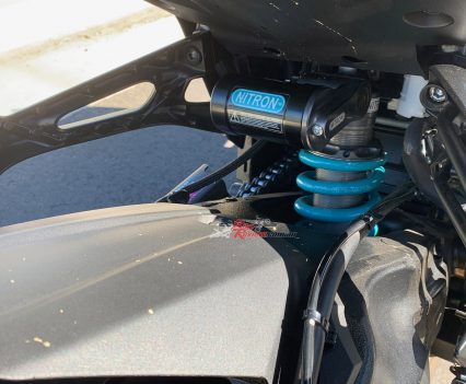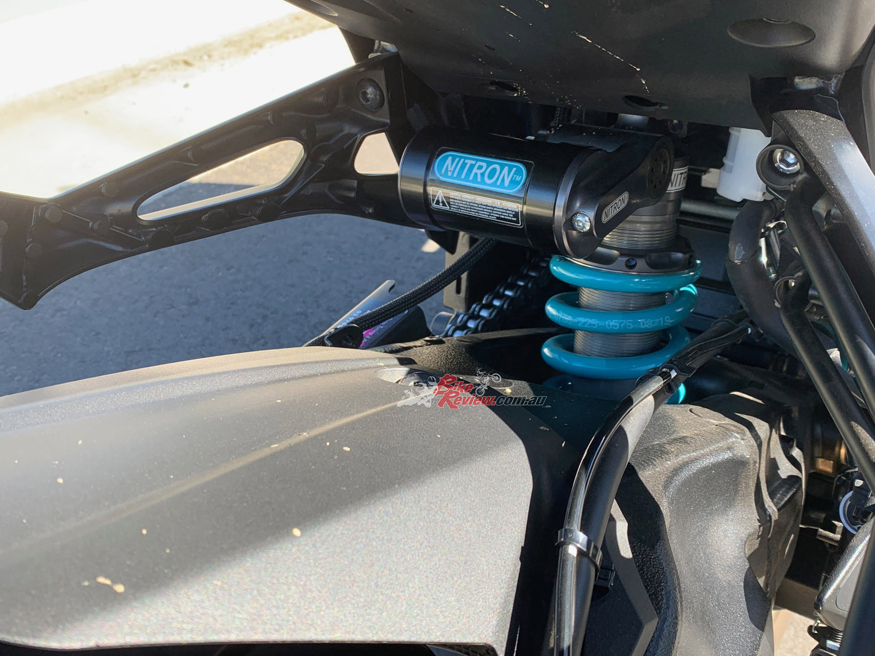 SUSPENSION: 43mm KYB fully adjustable telescopic forks, Nitron 22mm cartridges, Nitron rear shock, link type single shock, fully adjustable