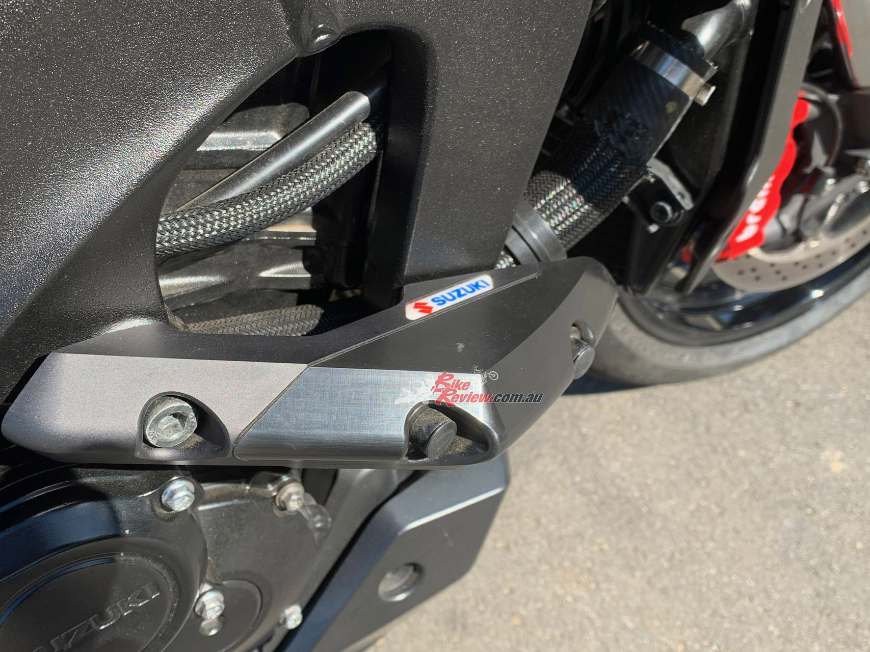 The Brembo four-piston monoblock calipers have 32mm pistons and squeeze 310mm rotors. The calipers are the same as used on the current GSX-R1000. ABS is by Bosch.