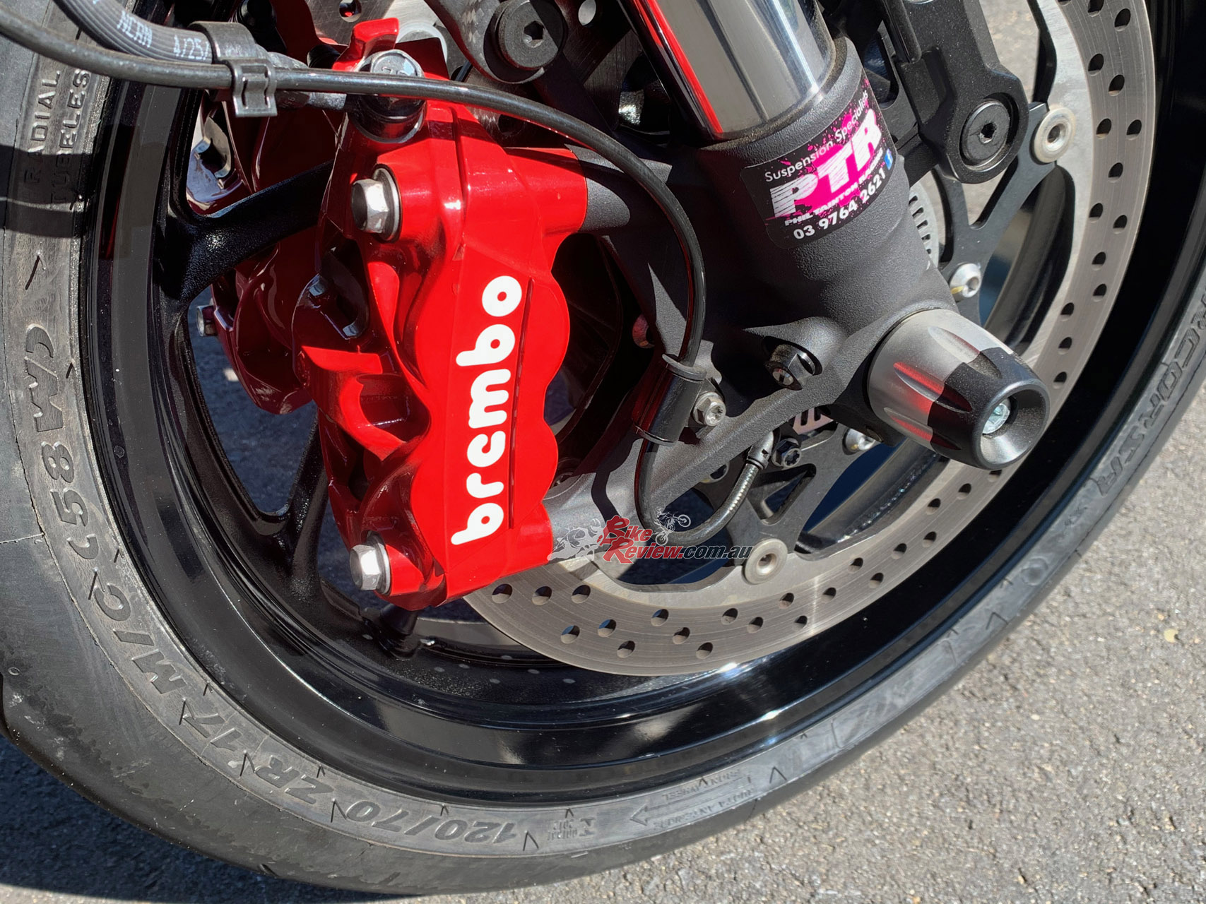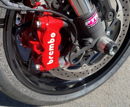 BRAKES: Bosch ABS system, Brembo radial-mount four-piston calipers, 310mm rotors, 220mm rear rotor with Nissin caliper, Nissin conventional master-cylinder