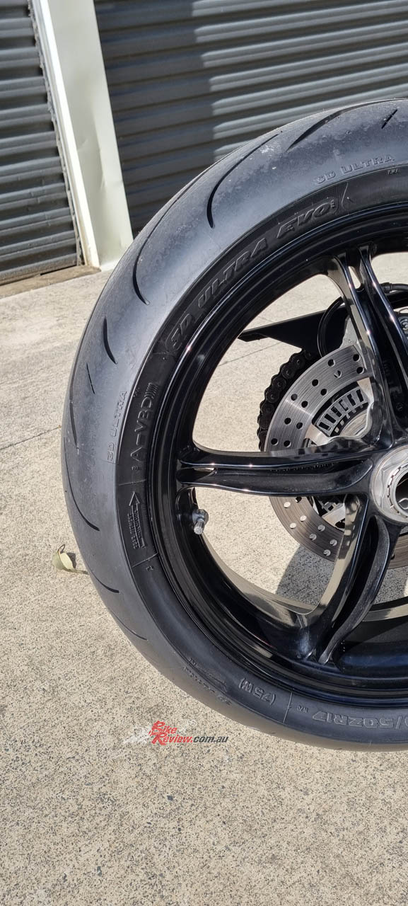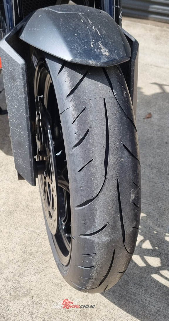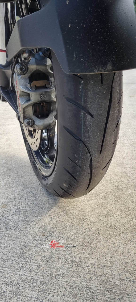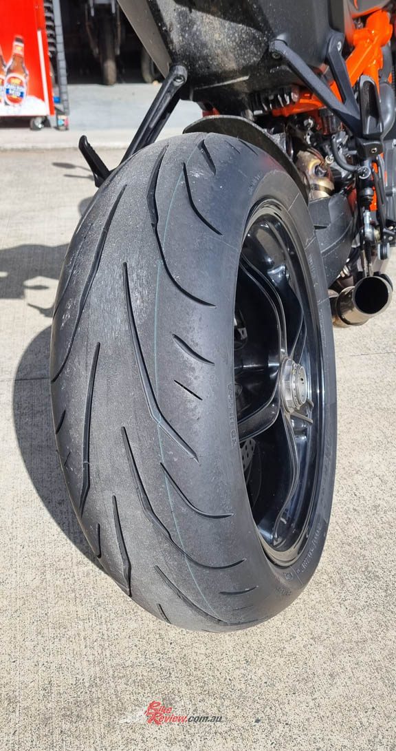 I haven’t done track days in years so I can’t comment on the track abilities, but they are more targeted at my type of riding anyway. A sportier style dual compound tyre made for real Aussie road riding that is great in corners, handles the punishment of a 1290cc twin take off, yet holds it’s shape well even after the long straight bits that inevitably come along. After two months of riding, they are still well shaped, especially for a more sporty tyre design and you can clearly see the lighter stripe in the centre of the tyre where the harder compound is.