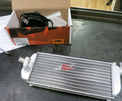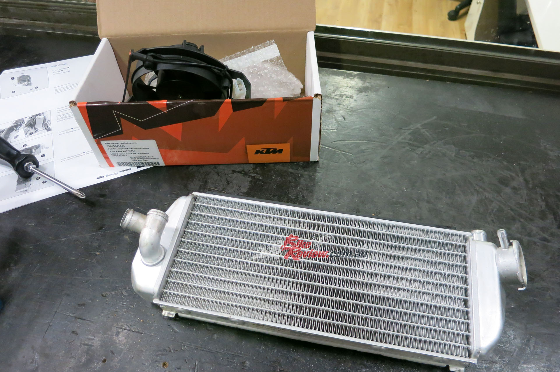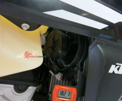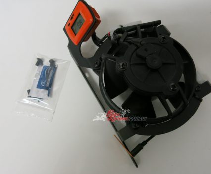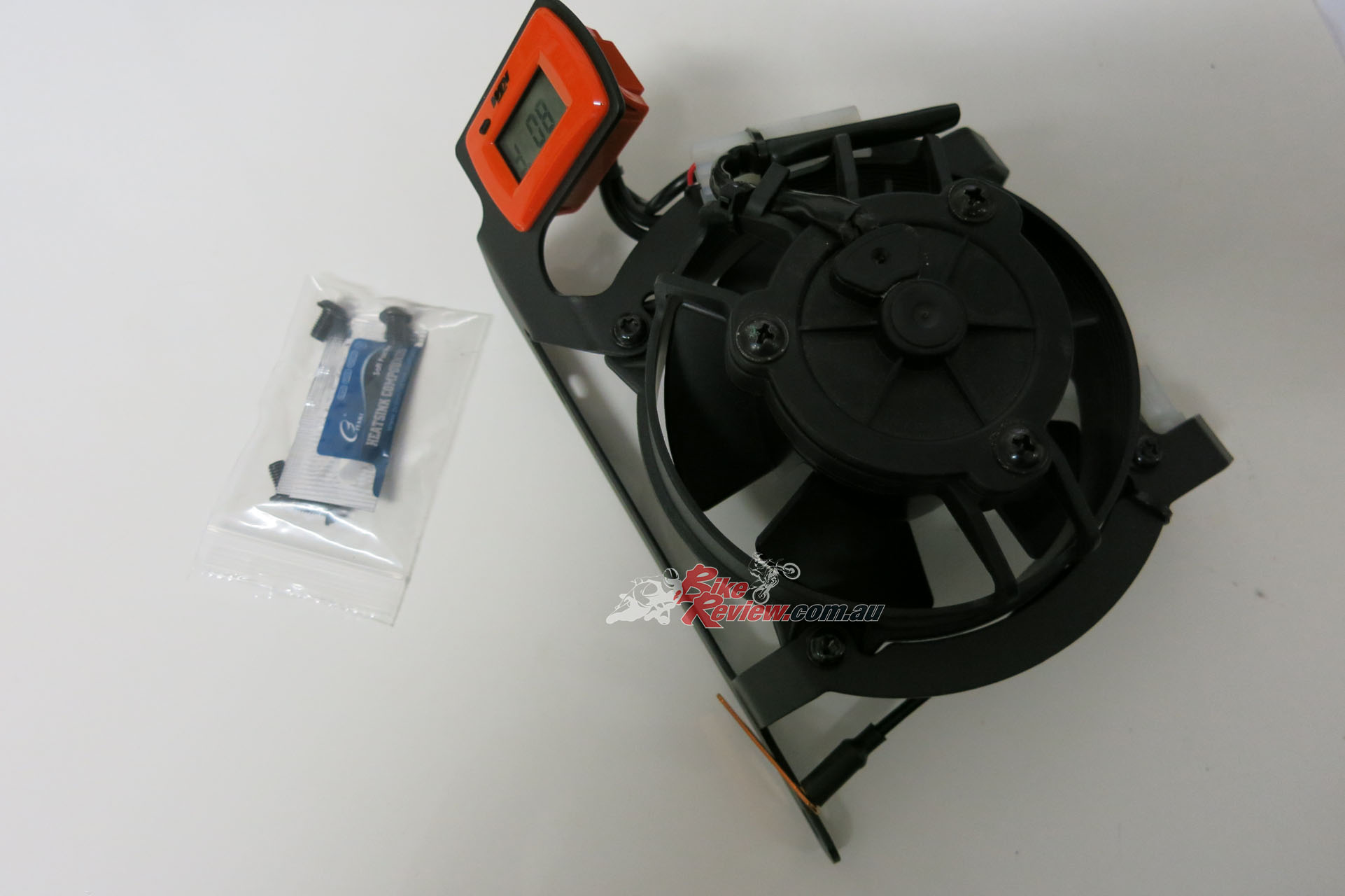 First up we fitted the must-have KTM Fan. This fan comes as a plug and play accessory and has a neat digital temperature gauge. It is programmable to switch between as low as 65ºC and 95ºC. I set it to Celsius display and left it on 95ºC so it is not going 24/7 in the bush. It does a top job and regulates the temperature fantastically.