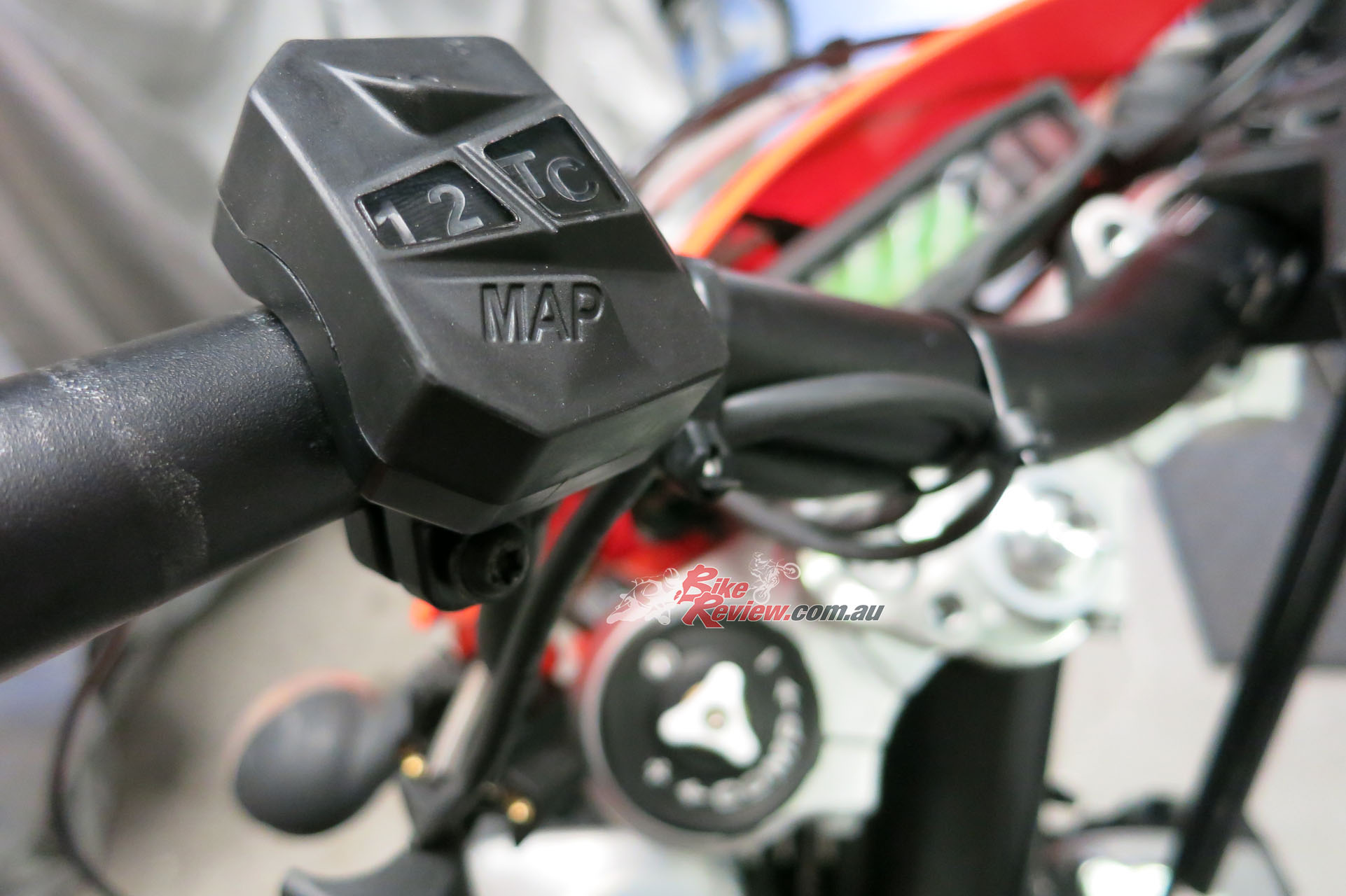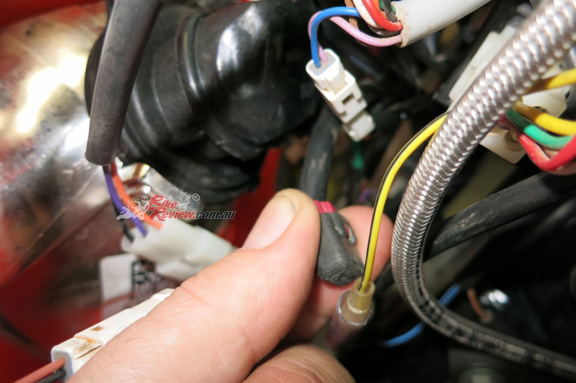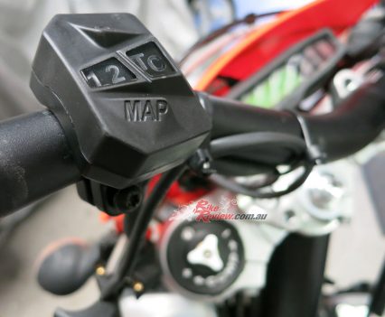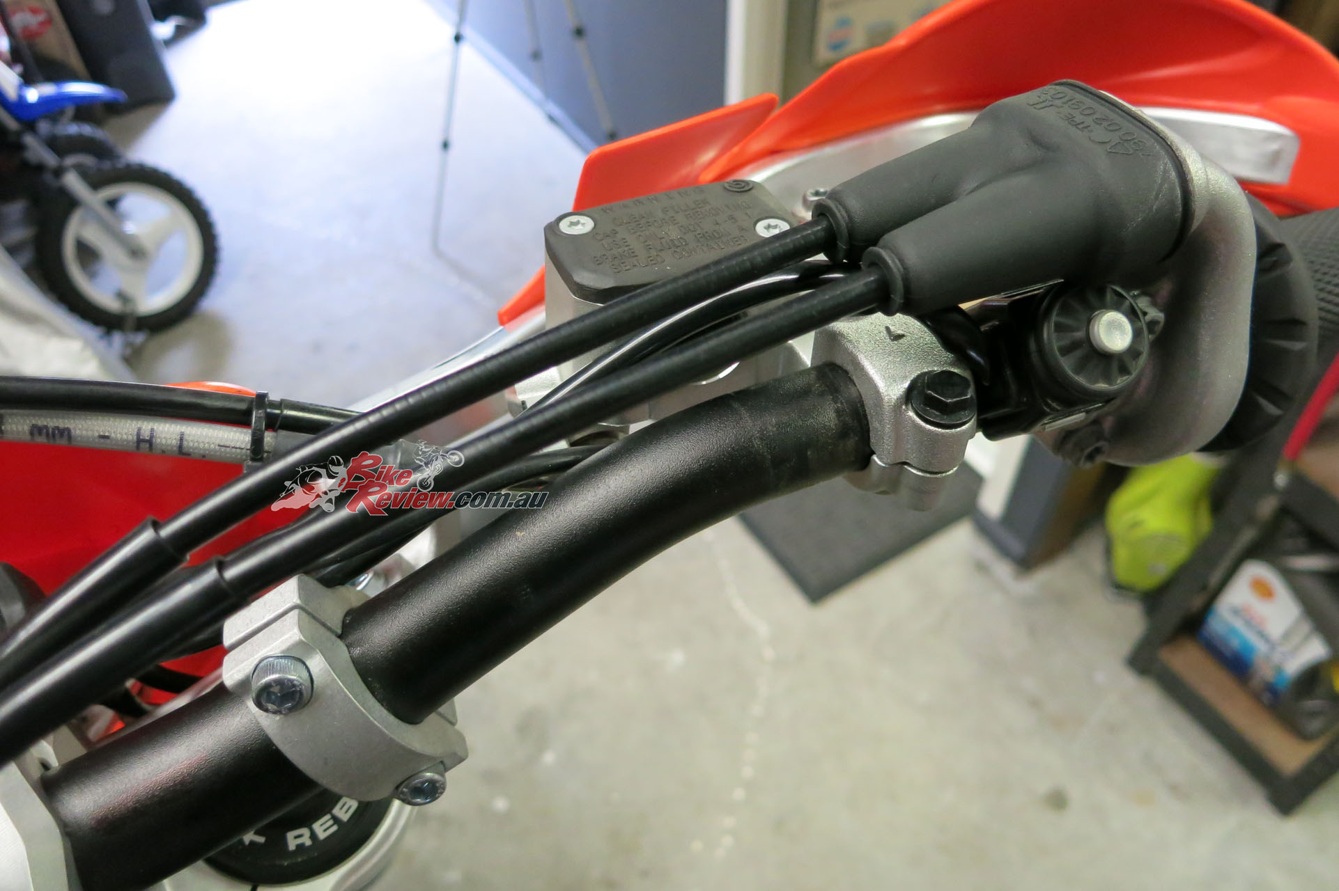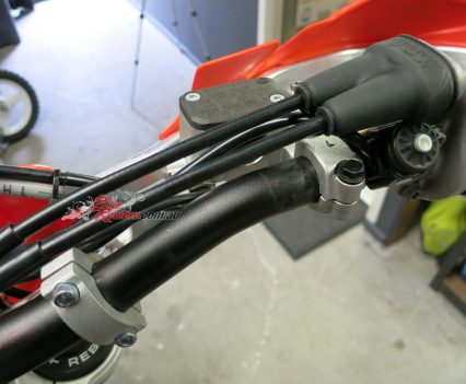 Next job on the list was to fit the Ignition Curve Switch and loom, so we could activate the two engine maps and Traction Control. Like the fan, this is an easy plug and play accessory. All that was required was to loosen the ODI lock on grip on the left side, loosen the handlebars and clutch lever carrier and move it all out of the way to slide the Map Switch on. The loom then runs down from the switch, under the headlight to the capped loom, ready to go!