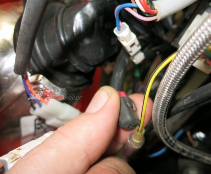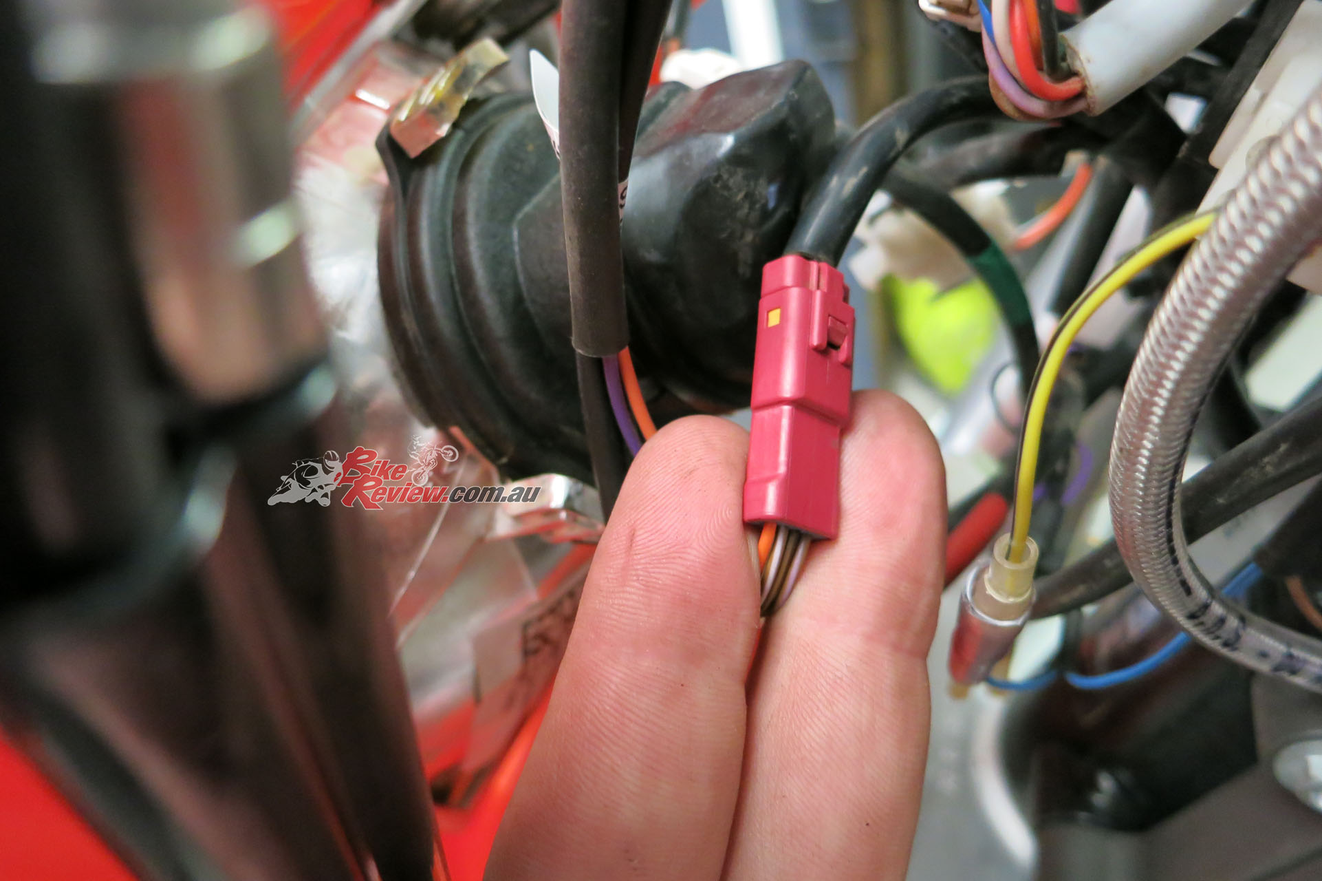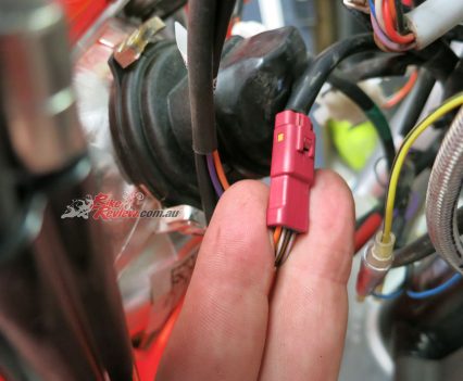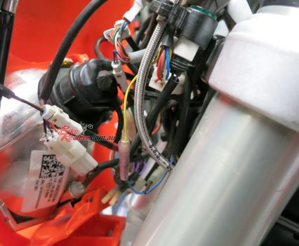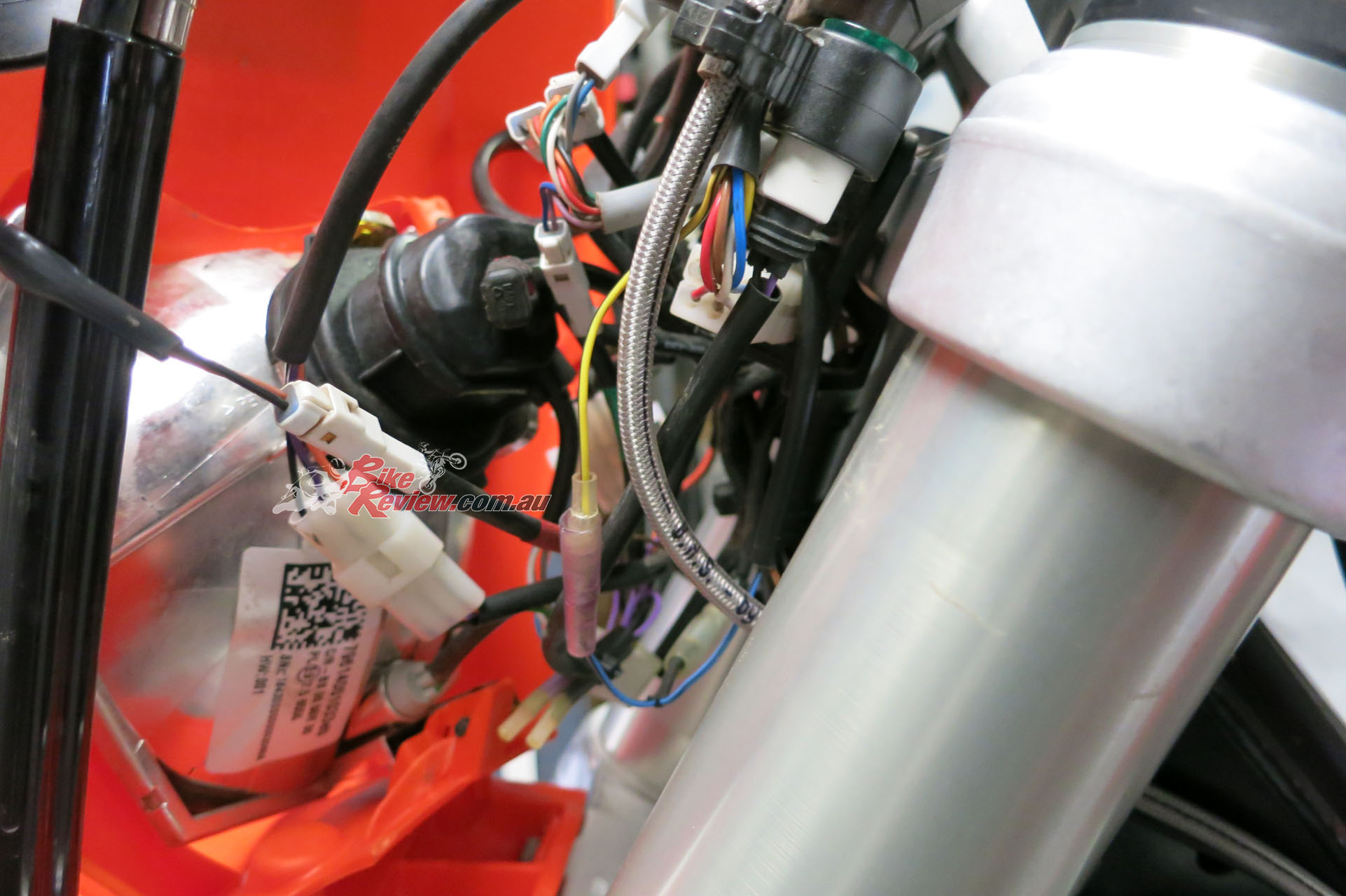 While I was playing with the wiring, it was decided to remove the standard R/H kill switch, as this was causing some issues. Whenever it got wet, the bike would not start. Removing it was easy and it was a matter of simply re-joining the connectors that the switch intercepted. This switch was an ADR requirement, so the original KTM switch remains active on the left switchblock and is much better.