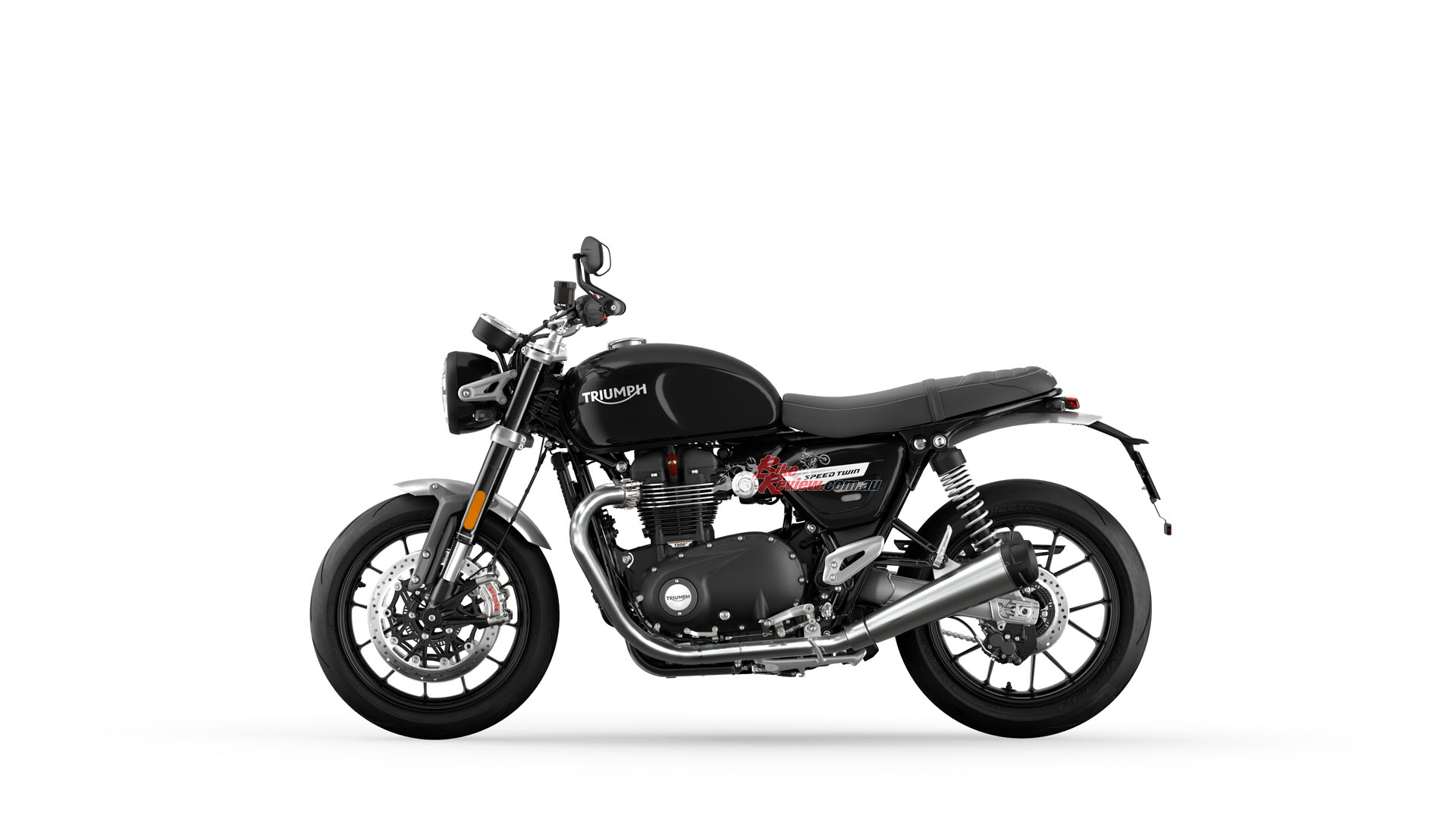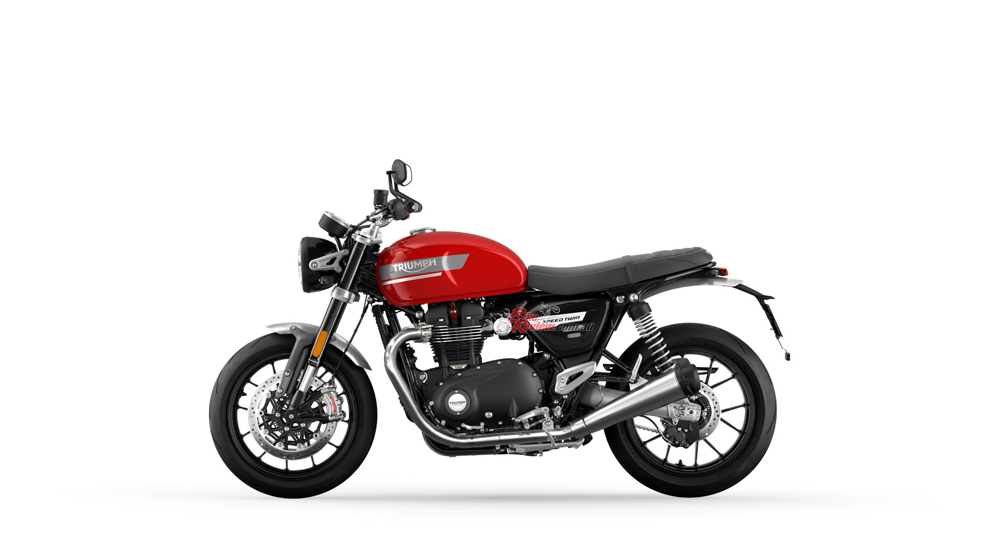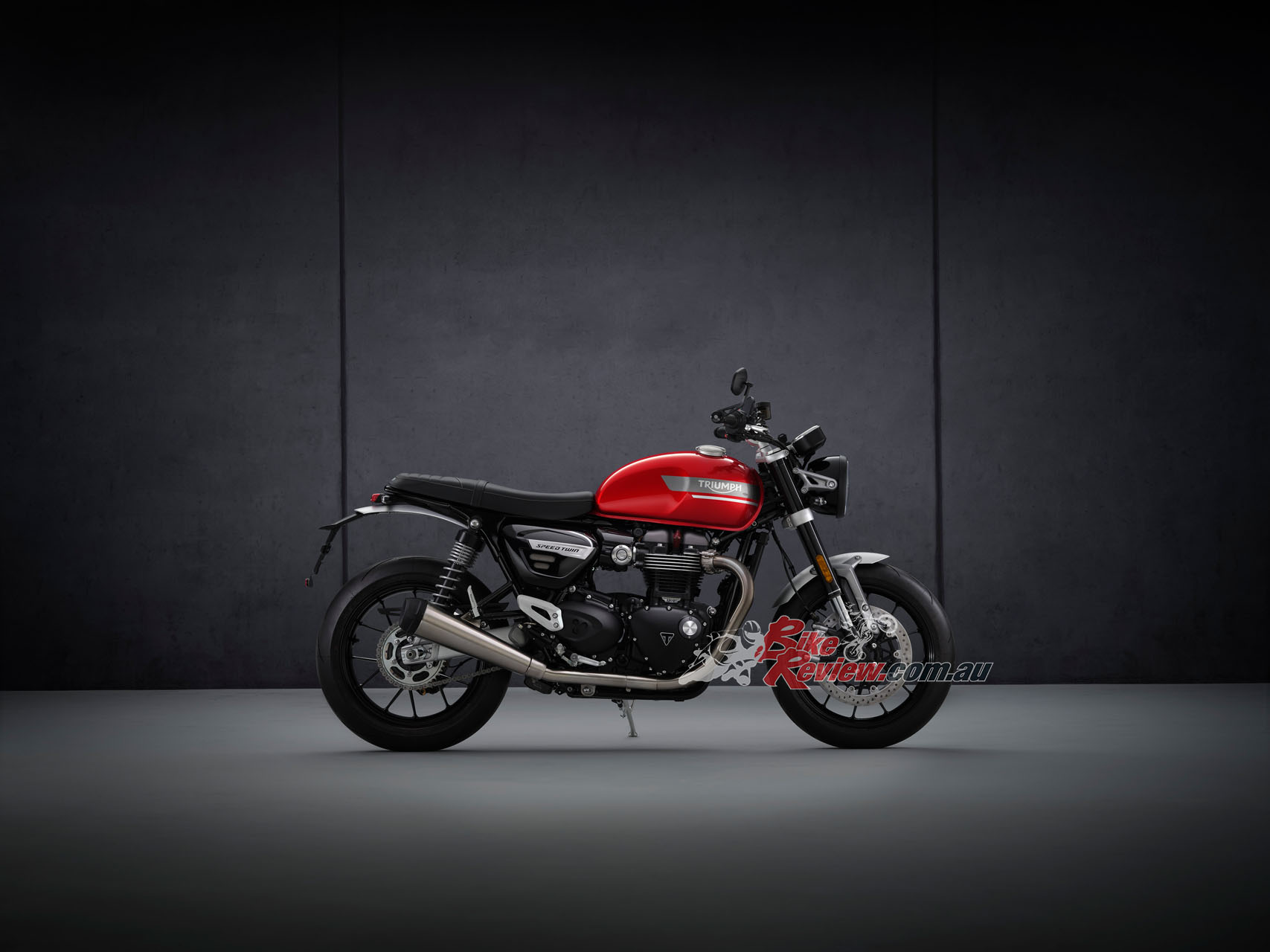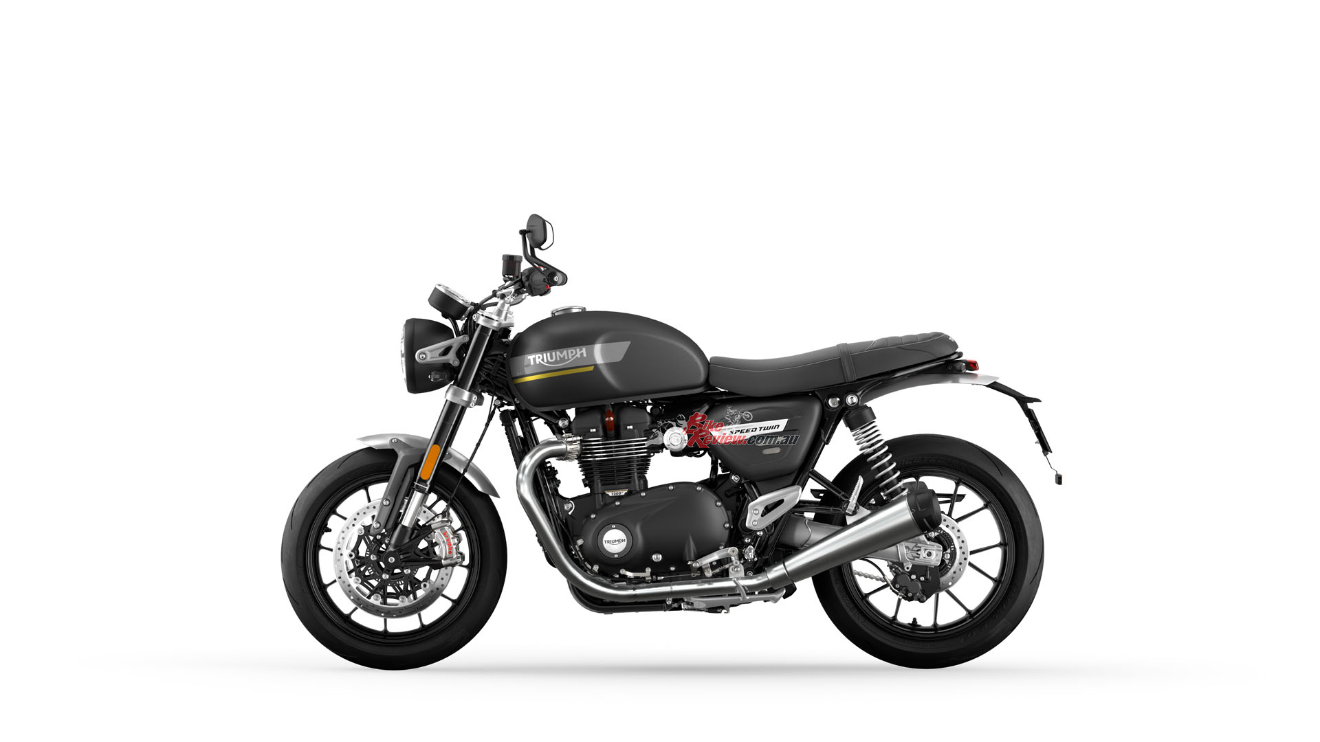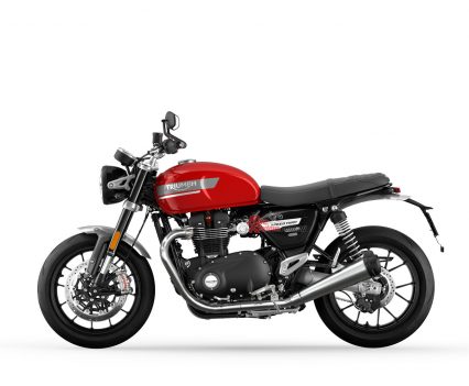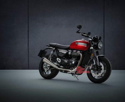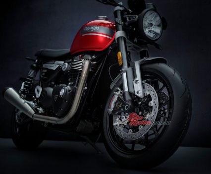 In addition to the new 12 spoke cast wheels and twin upswept sporty silencers with brushed stainless-steel headers, the Speed Twin is characterised by its signature-shaped 14.5L tank with knee indents, bar end mirrors, sculpted side panels and a bench seat.