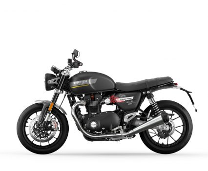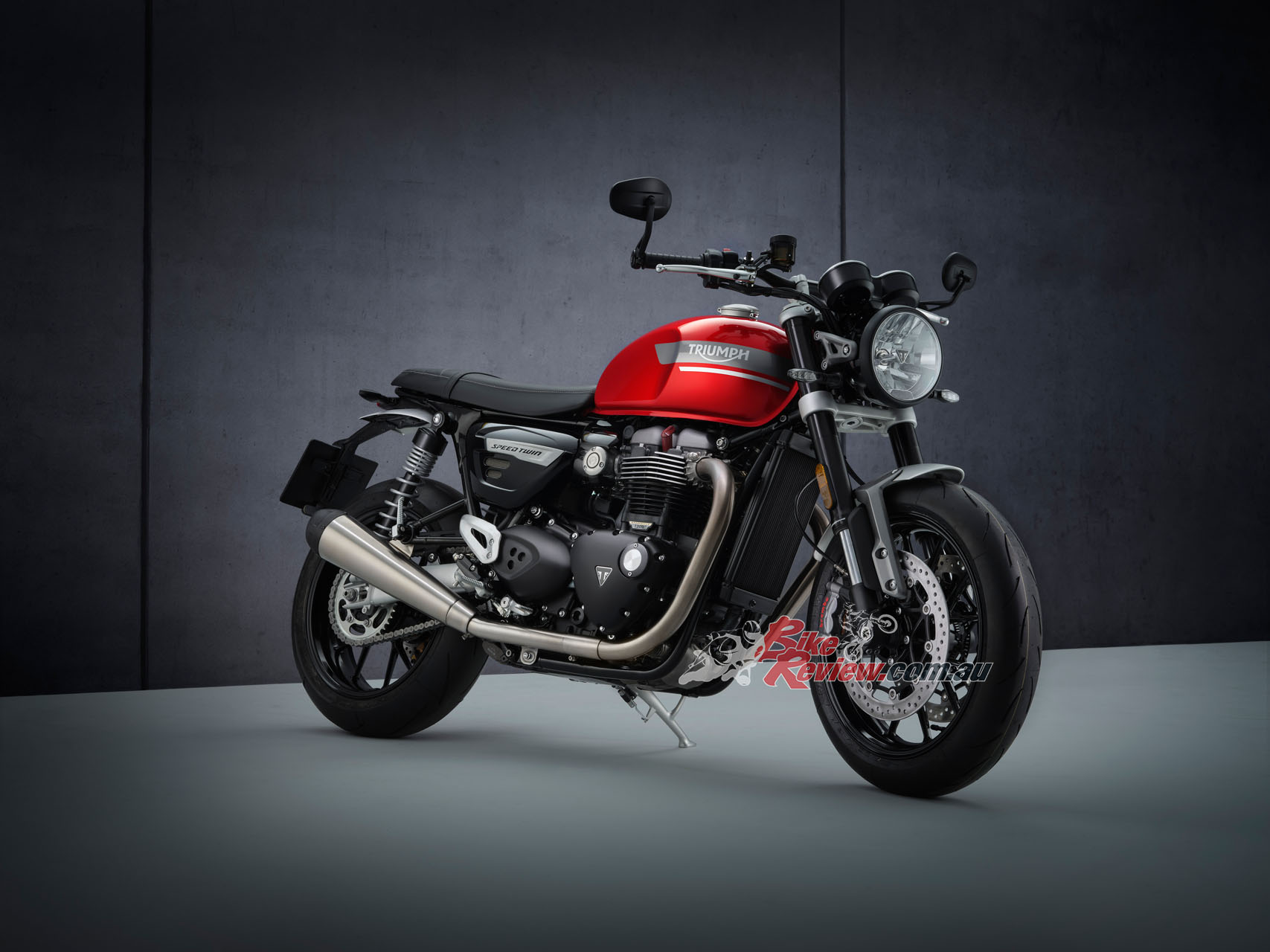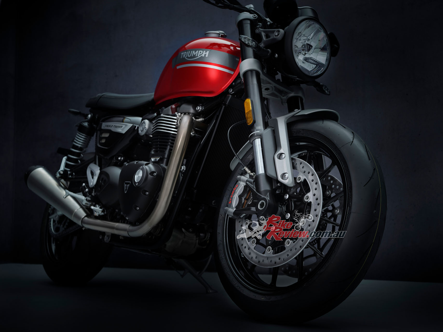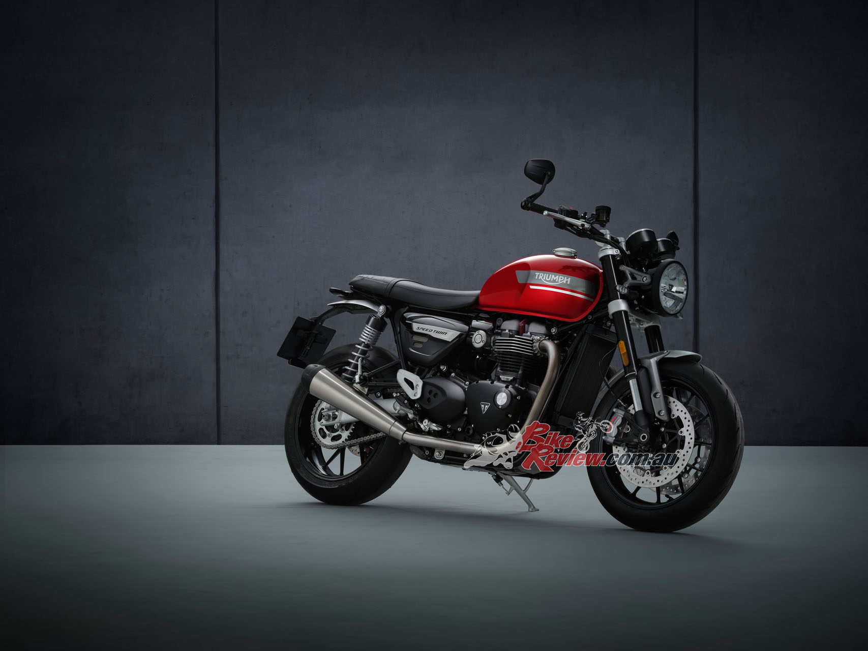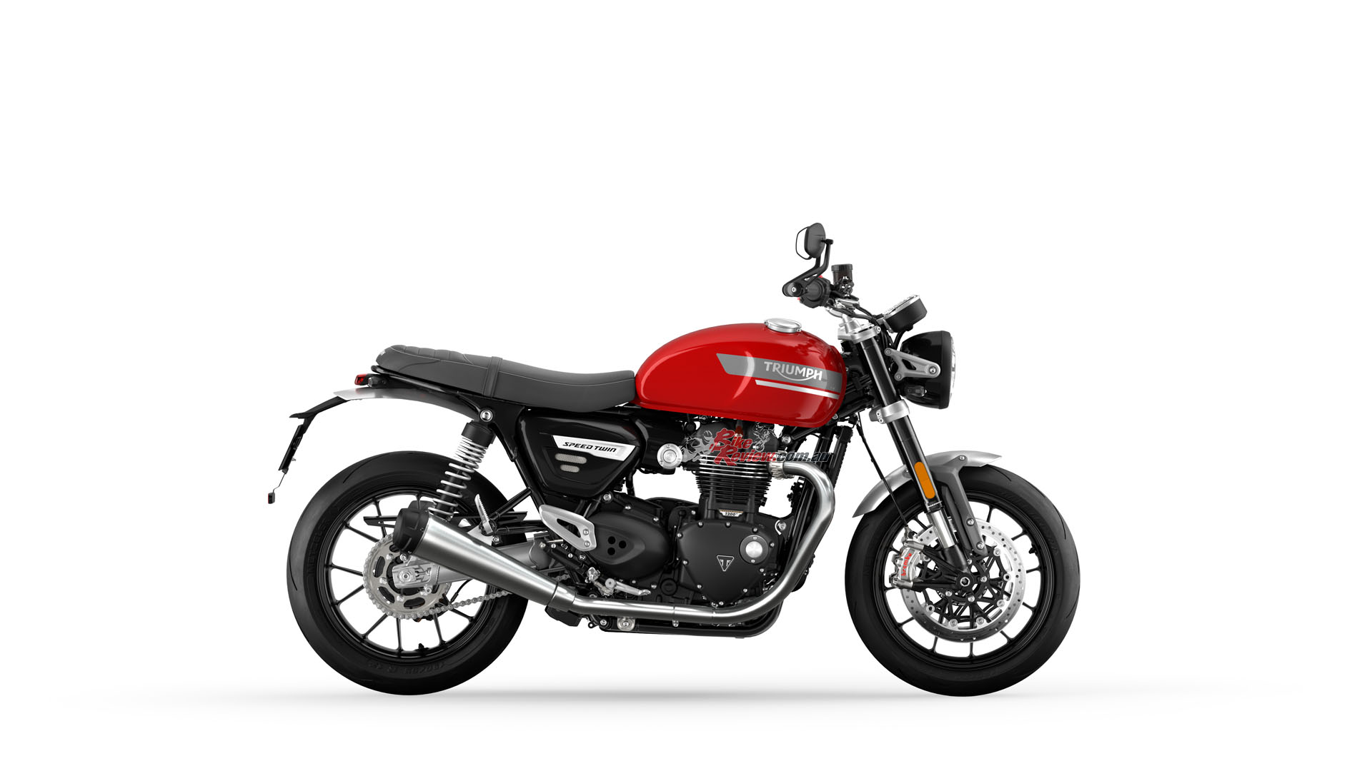 In addition to the new 12 spoke cast wheels and twin upswept sporty silencers with brushed stainless-steel headers, the Speed Twin is characterised by its signature-shaped 14.5L tank with knee indents, bar end mirrors, sculpted side panels and a bench seat.