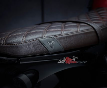 The ergonomics are proportioned with an accessible 809mm seat height, a slim stand over width, tapered handlebars and a comfortable roadster foot-peg position, which are 38mm further forward and 4mm lower than the Thruxton, providing the rider with a more relaxed riding position.