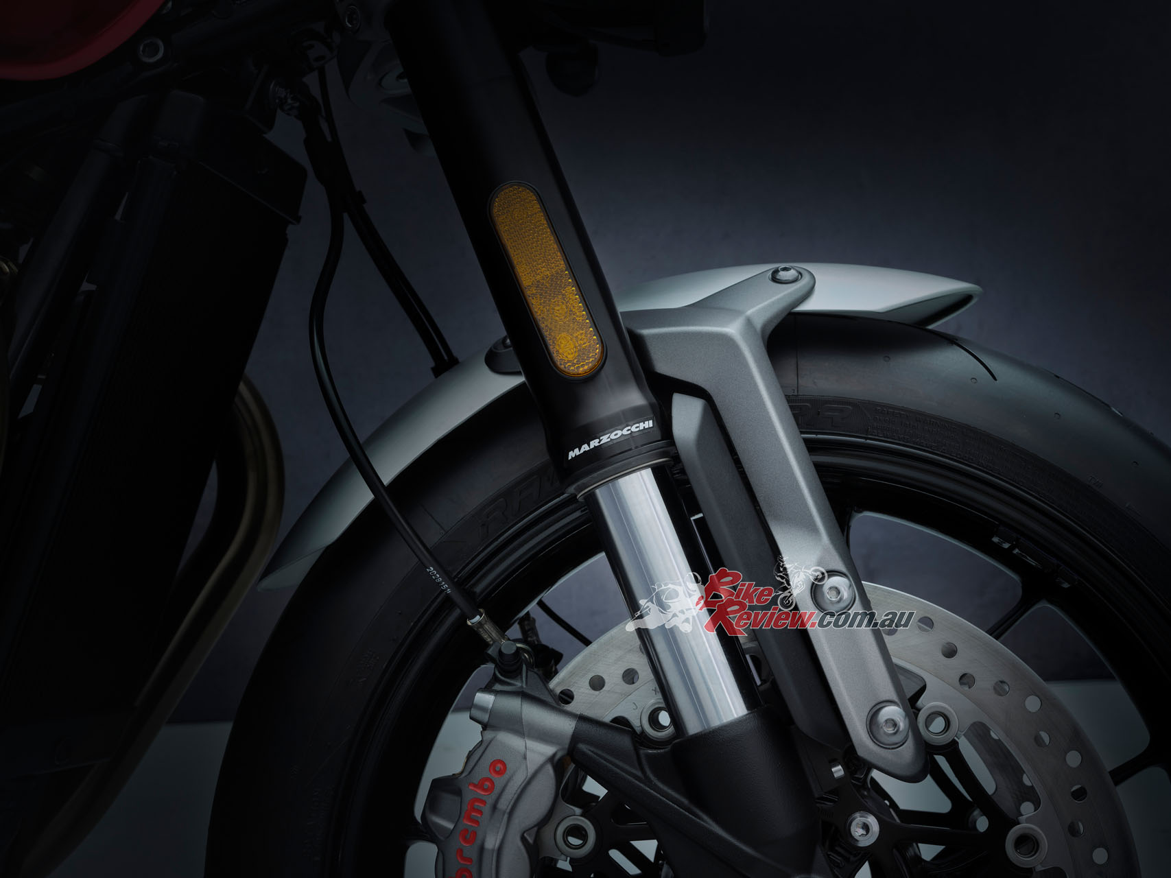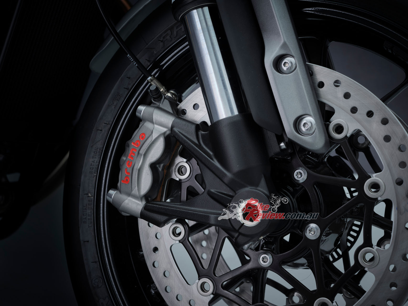 Brakes: 320mm discs, Brembo M50 4-piston radial monobloc calipers, ABS (f), 220mm disc, Nissin 2-piston floating caliper, ABS (r)