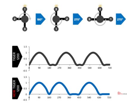 Designed to deliver all the advantages that have made the Triumph Tiger 900 so successful in the middleweight category, the new the T-plane triple crank brings the best of both worlds, with the low down tractability of a twin at the bottom end, making it great off road, combined with the performance benefits of a triple at the top end, which makes the Tiger even better on the road where riders spend most of their time.  Technically, the T-plane crank gives the new Tiger 1200 engine firing pulses at 180, 270 and 270 degrees, resulting in one short gap and two long gaps between the firing, delivering improved character and tractability at low rpm.