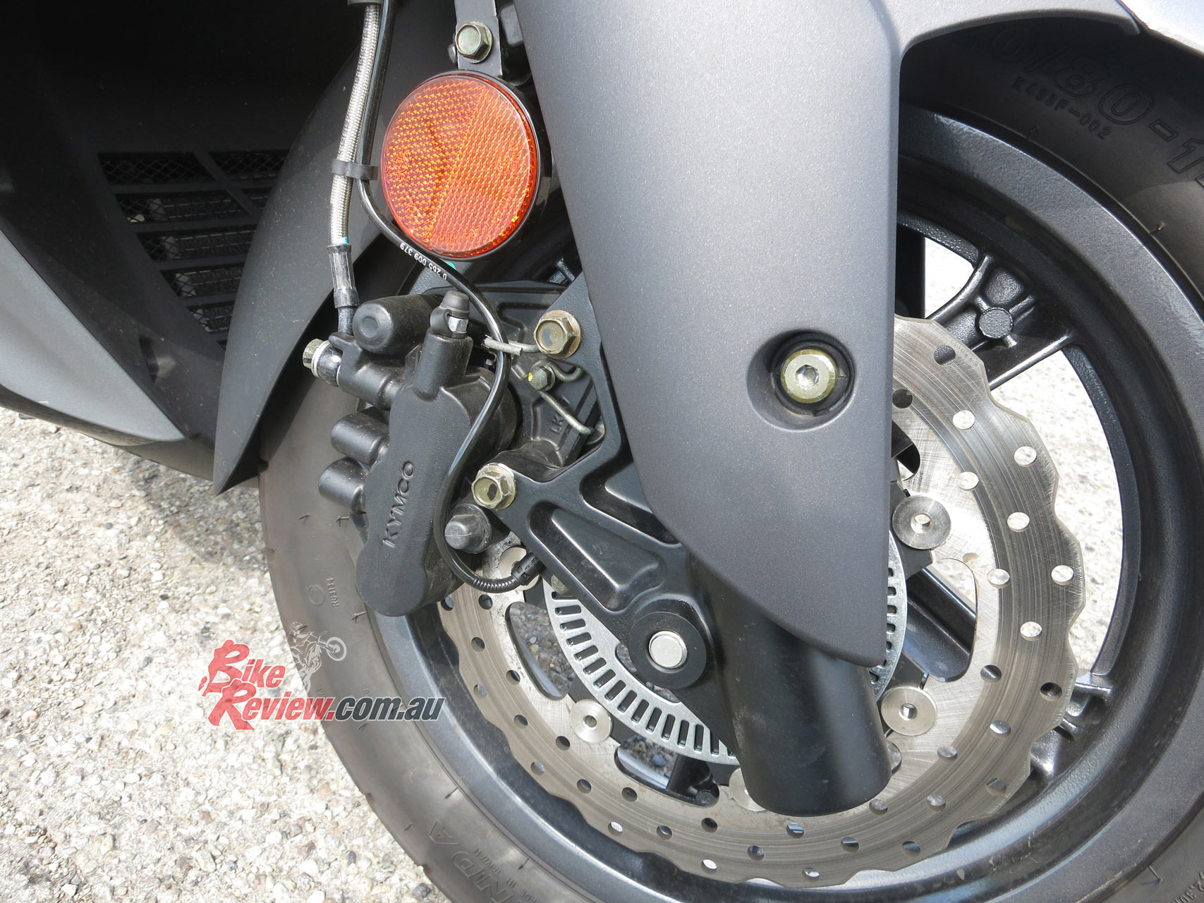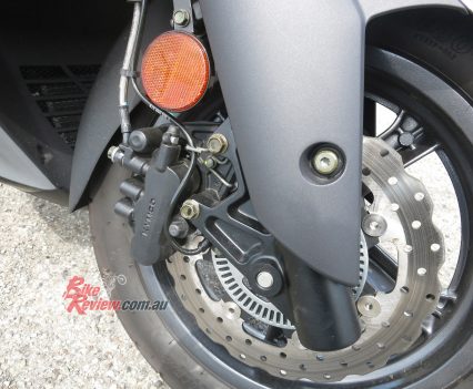 Braking performance is impressive. The 260mm front and 240mm rear triple-piston equipped (front) brakes are strong. Initial bite is progressive enough to be friendly but power is there with a gentle squeeze. The Bosch 9.1M ABS backs up the braking performance and works well – I tested it with multiple emergency stops, some loose gravel stops and even managed a wet road stop in some roadworks. The front brake alone is strong, the rear not quite enough on its own (as it can be on some scoot’s), however, the two combined really pull the Downtown up rapidly. Impressive stuff…