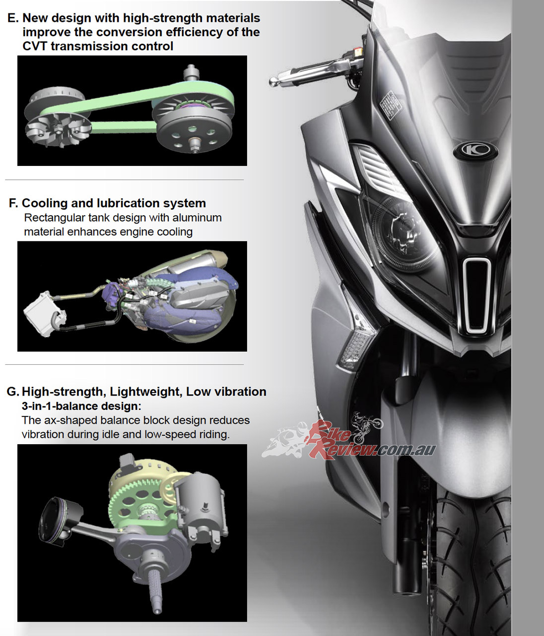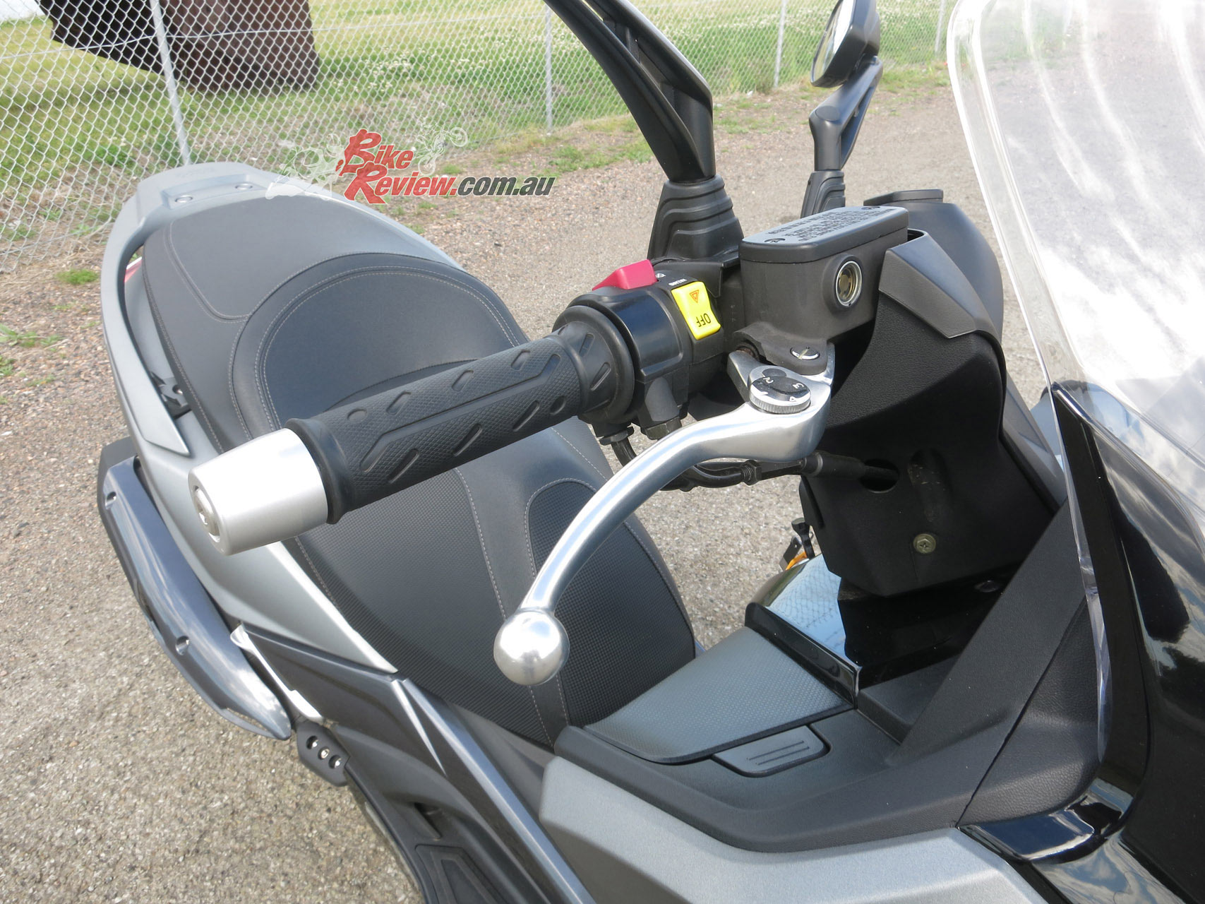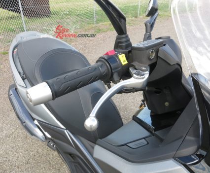 The sidestand is handy and easy to flip down and the centrestand leverage ratio is great, a slight lift on the large grabrail has the machine propped up – no effort required. Seat height is taller than most scooters, 30mm more than the C 400 X standard seat and the XMax as well. At 810mm it suited me at 185cm tall. Shorter riders shouldn’t have any issues, as the seat is narrow enough at the front to hop on and off by stepping through the footwell and sitting back from there. It is a bit of a step up through the tall footwell – the price to pay for a proper tubular steel trellis styled frame. Well worth it…