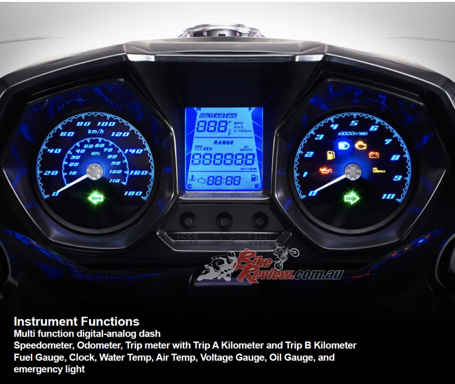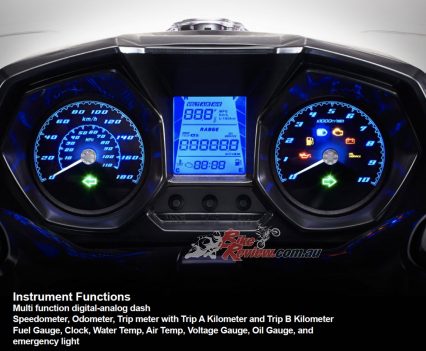 Instruments: LCD multi-display, speedo, odo, trips, fuel, water temp, air temp, voltage, oil warning, emergency light.