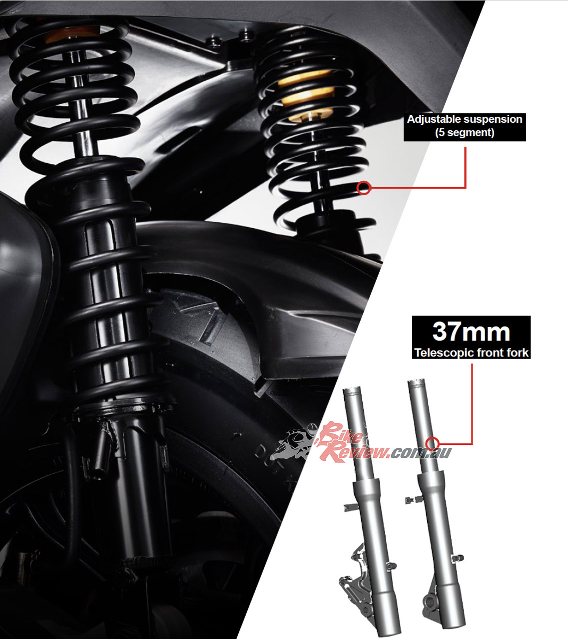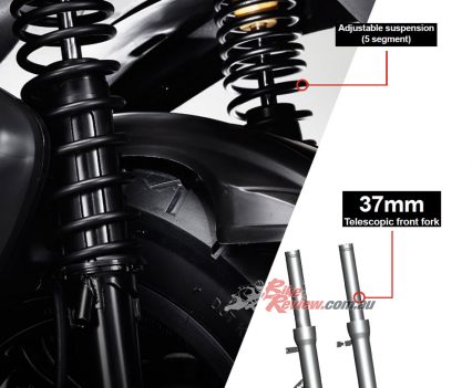 Suspension: Telescopic forks, twin shocks with 5-way preload.