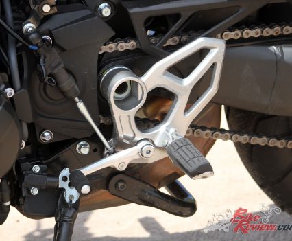 Engine: Liquid-cooled, crossplane triple, 12-valve four stroke, 78 x 59.1mm bore x stroke, 847cc, 11.5:1 compression, fuel injected with selectable three engine modes, traction control three levels