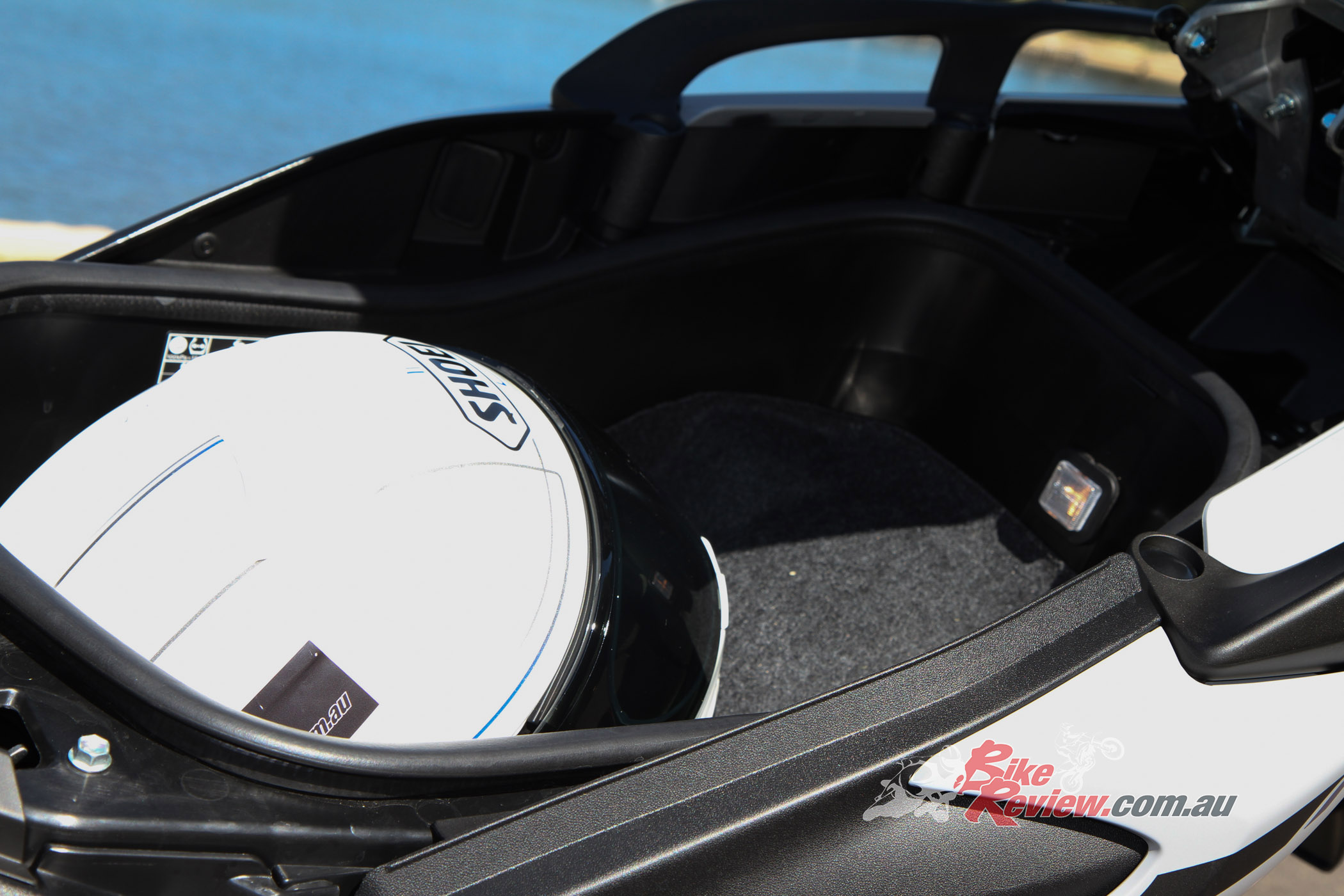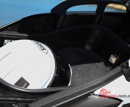 Storage: Underseat storage to fit a full face helmet with light that activates on opening, Glove box with cigarette lighter type power fitting