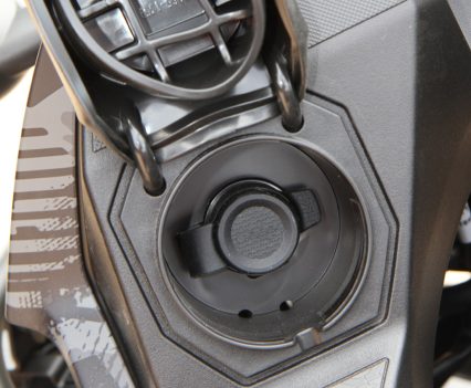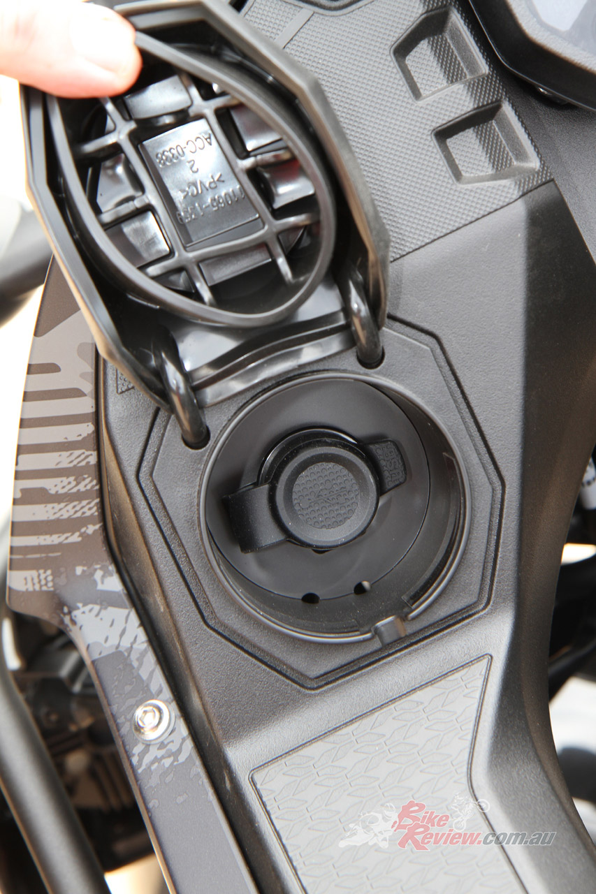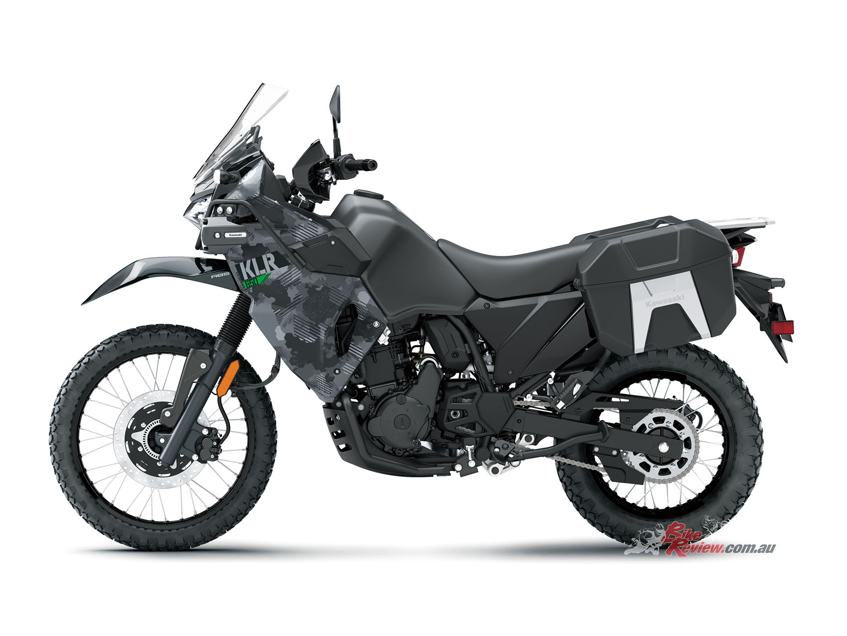 For the 2022 KLR650, a change to fuel injection offers a claimed increase in reliability and fuel efficiency. A new fuel tank design that minimises residual fuel volume, numerous strengthened parts and increased riding confidence when carrying luggage, reduced vibrations and increased generator capacity contribute to improved reliability and ride comfort.