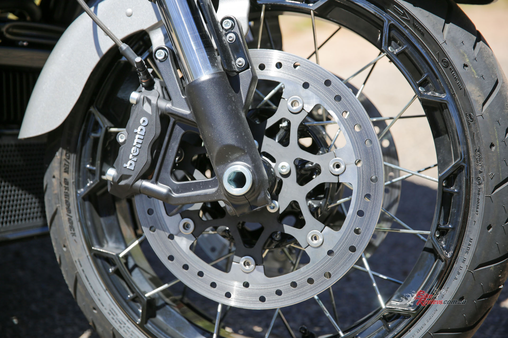 Braking is provided by Brembo components, dual front disc brakes feature new radially mounted four-piston Brembo callipers. The front brake rotor diameter is increased to 320mm from 300mm (previous models). The single rear brake features a four-piston Brembo calliper.