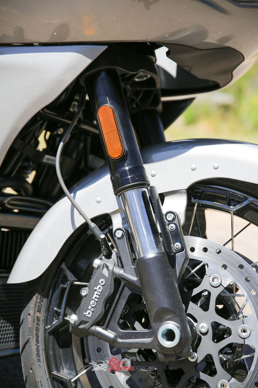 Front suspension is 47mm SHOWA inverted forks with 117mm of travel, while the rear sees 76mm of travel. This is a 50 percent increase in travel compared to comparable 2022 Grand American Touring models. SHOWA dual outboard emulsion technology shock absorbers feature a new remote hydraulic pre-load adjustment knob located forward of the left saddlebag.