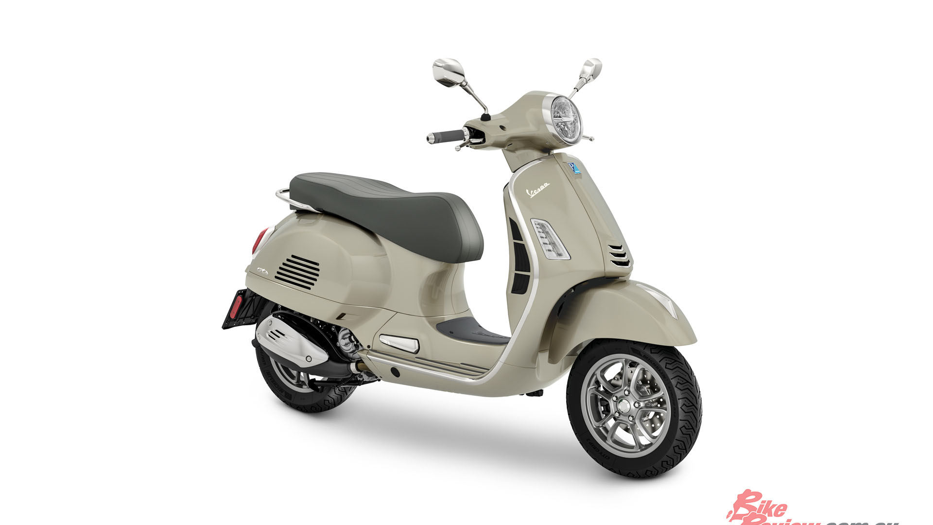 The Vespa GTS Classic is available in Beige Sabbia, Nero Vulcano and Verde Relax. Every detail is enhanced with chrome. The grey seat, with vertical heat sealing on the seat area and tone-on-tone stitching, is paired with hand grips and rubber inserts on the footpegs, also grey. The wheels are painted grey.