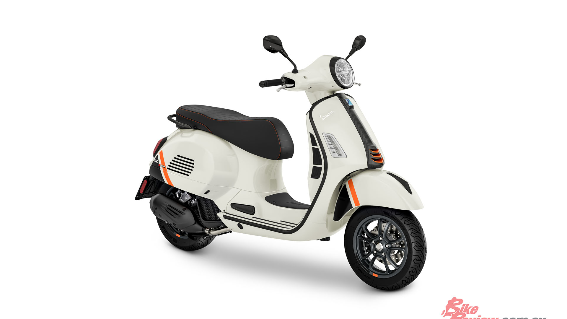 The Vespa GTS SuperSport features graphite-coloured rims with dedicated graphics and the many black details, starting with the profile that runs along the perimeter of the body. The typical steering cover on the shield presents a brand-new carbon look finish and is made more aggressive with neon orange decorations. The black seat stands out for its horizontal heat sealing and double stitching in contrasting neon orange. Three available colours are enhanced with new dedicated graphics, gloss Bianco Innocente, matte Nero Opaco and Verde Olivie.
