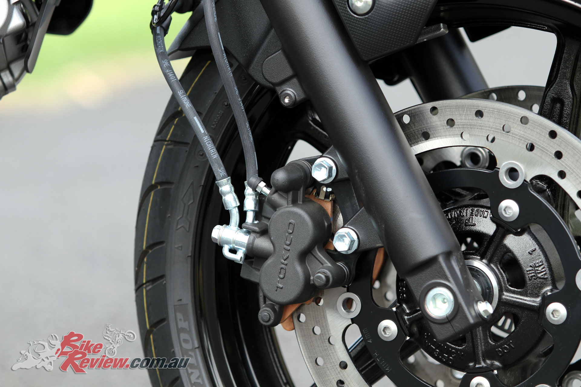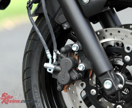 Brakes: Nissin ABS, dual 290mm front rotors, two-piston Tokico calipers, single 240mm rear rotor, single-piston caliper