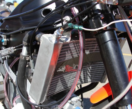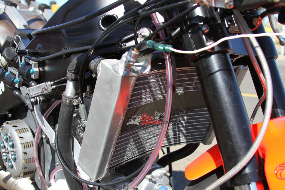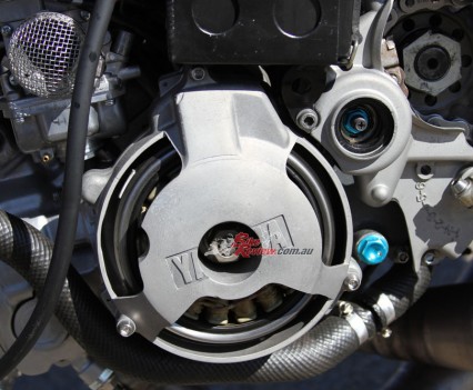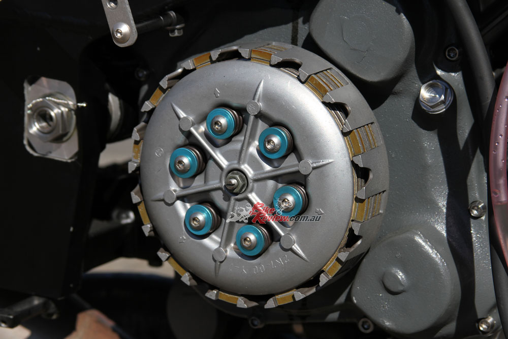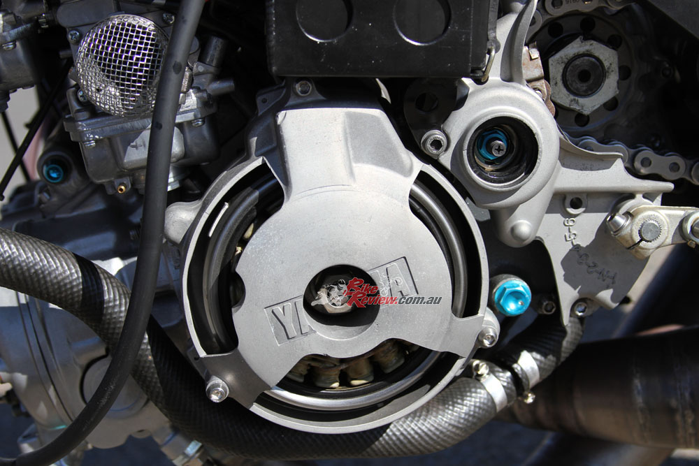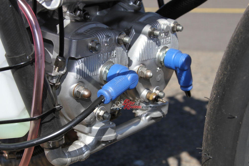 An extended input shaft allows the dry clutch conversion and the oil pump system is removed, with a cast magnesium cover giving the GP look. An electric water pump is employed and the radiator is a Costin Engineering item, with a TZ250 water bottle used.