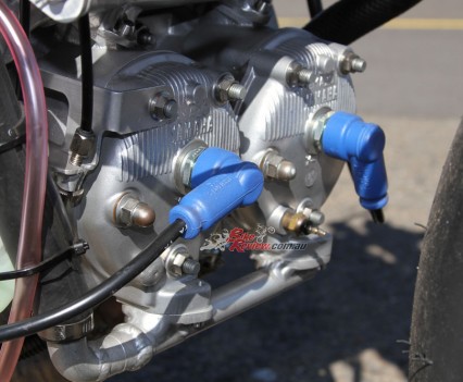 “Costin Engineering cylinders with individual power-valve controllers and YZR500-style water jackets”…